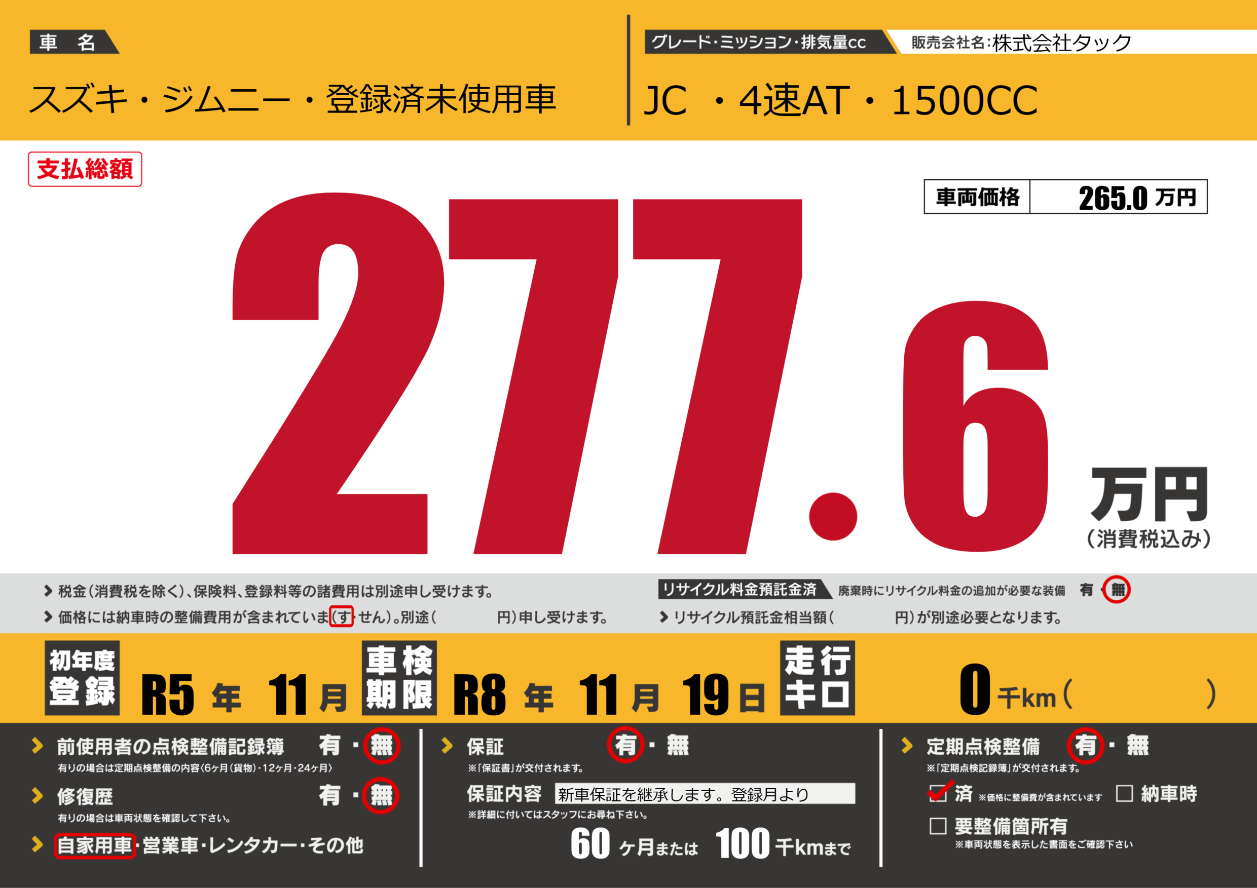 | 定期点検整備 | 定期点検整備あり 定期点検整備済み | ||