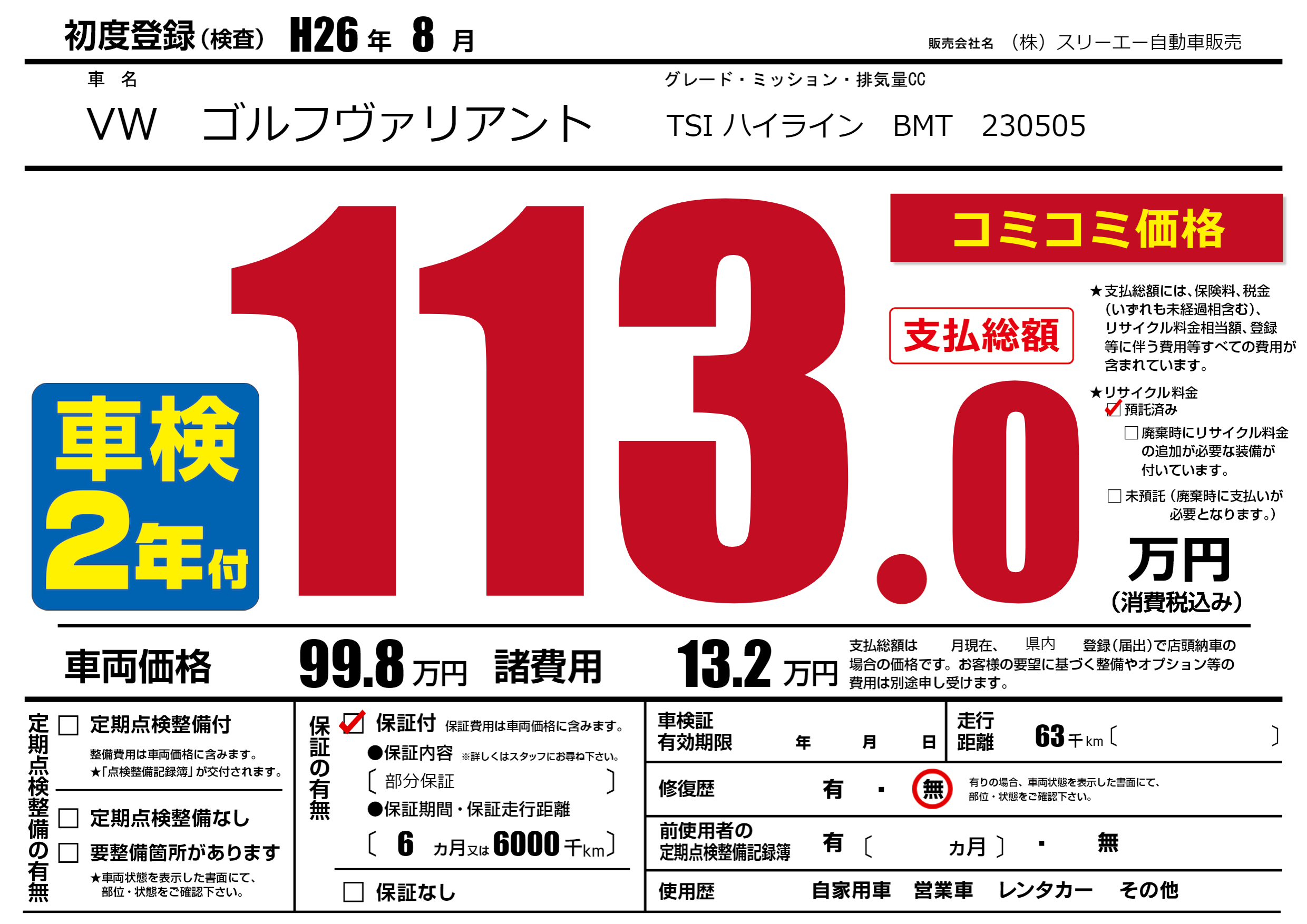 | 車名 | VW ゴルフヴァリアント | グレード ミッション 排気量 |