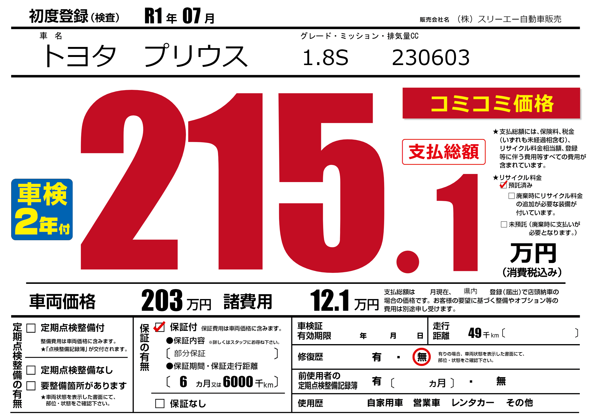 保証付き 保証内容(部分保証) 6ヶ月または(6000)千kmまで |