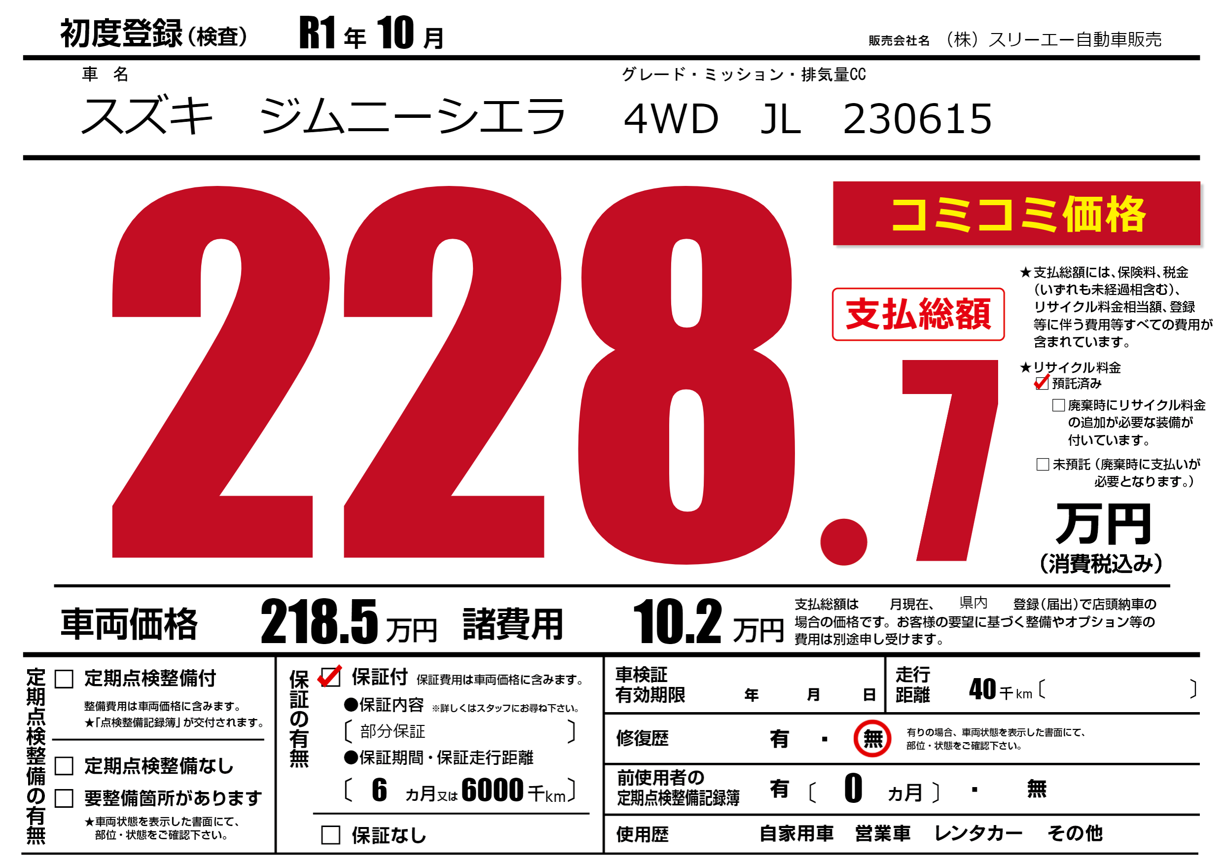 | 車名 | スズキ ジムニーシエラ | グレード ミッション 排気量 |