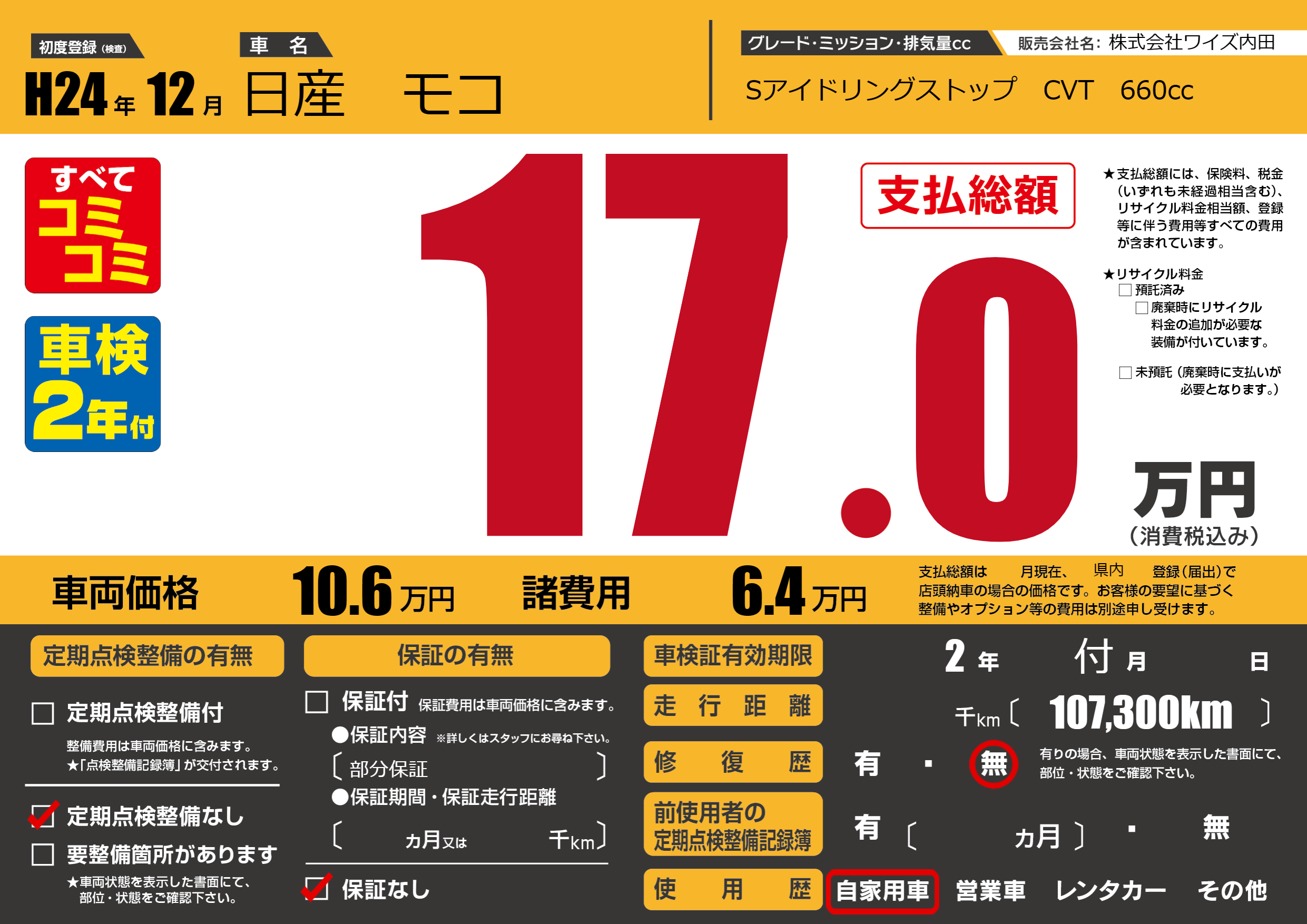 | 車名 | 日産 モコ | グレード ミッション 排気量 |