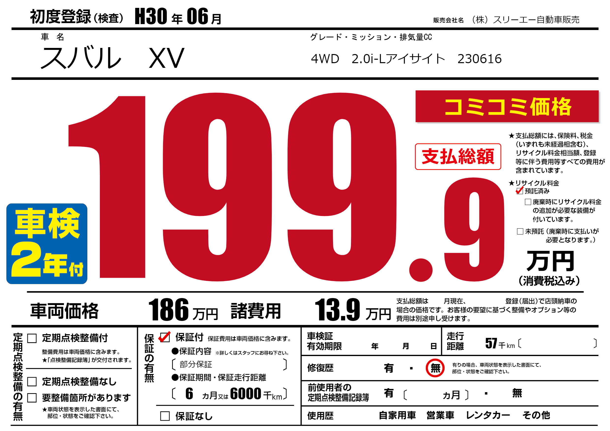| 車名 | スバル XV | グレード ミッション 排気量 |