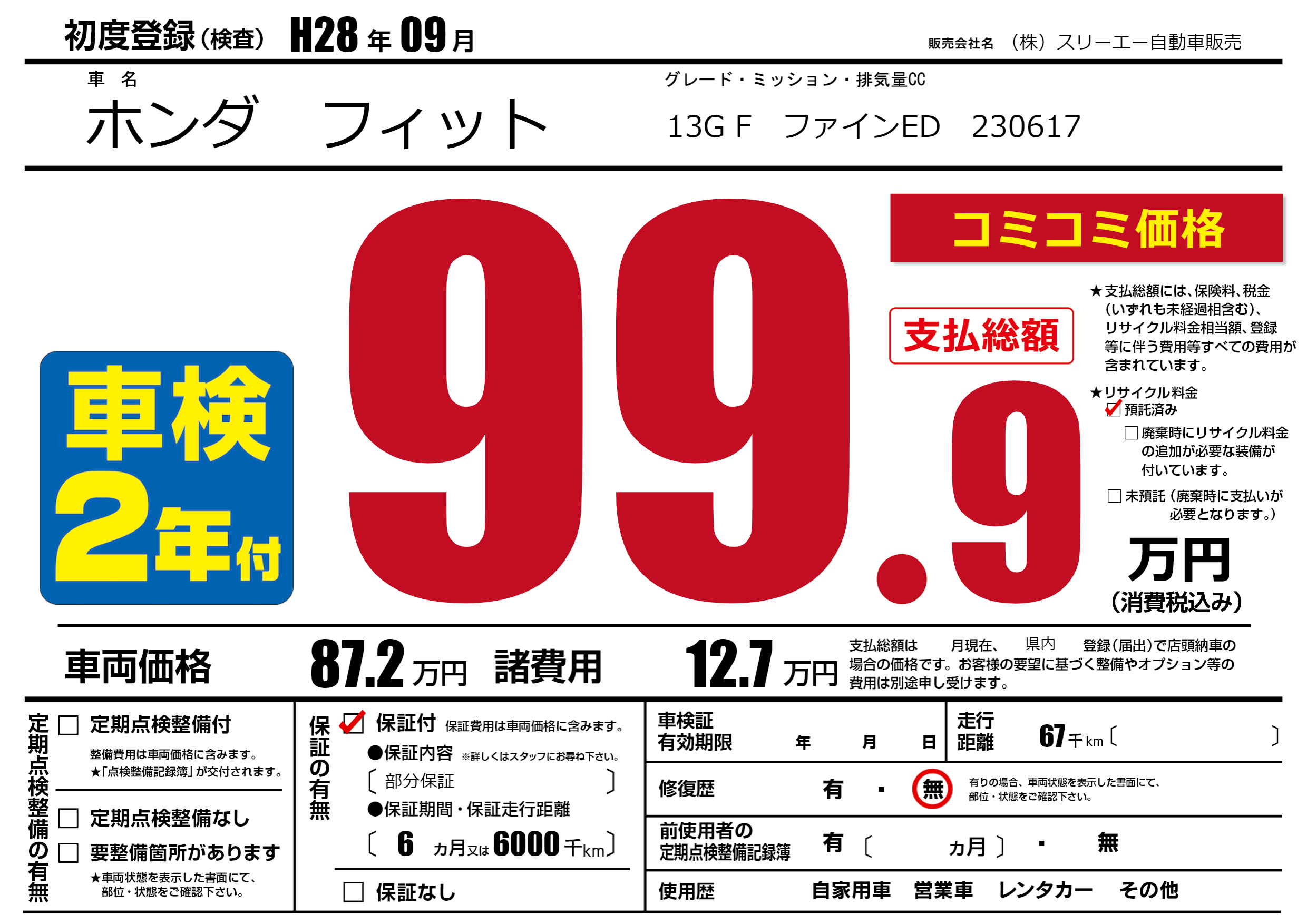 保証付き 保証内容(部分保証) 6ヶ月または(6000)千kmまで |