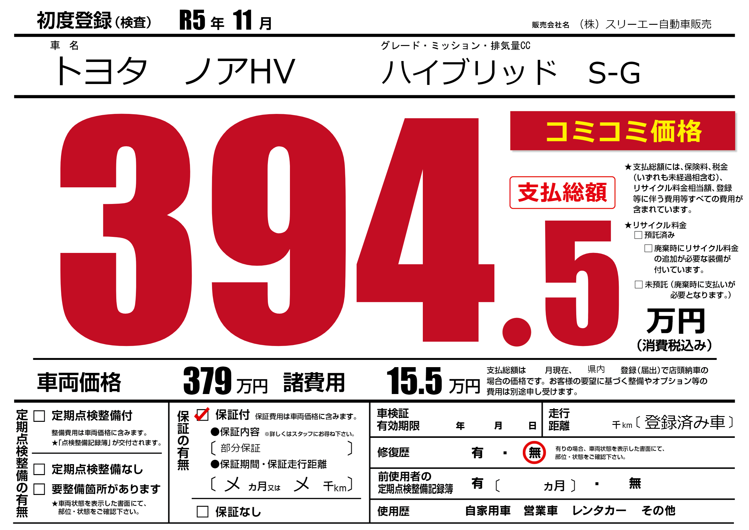 | 車名 | トヨタ ノアHV | グレード ミッション 排気量 |