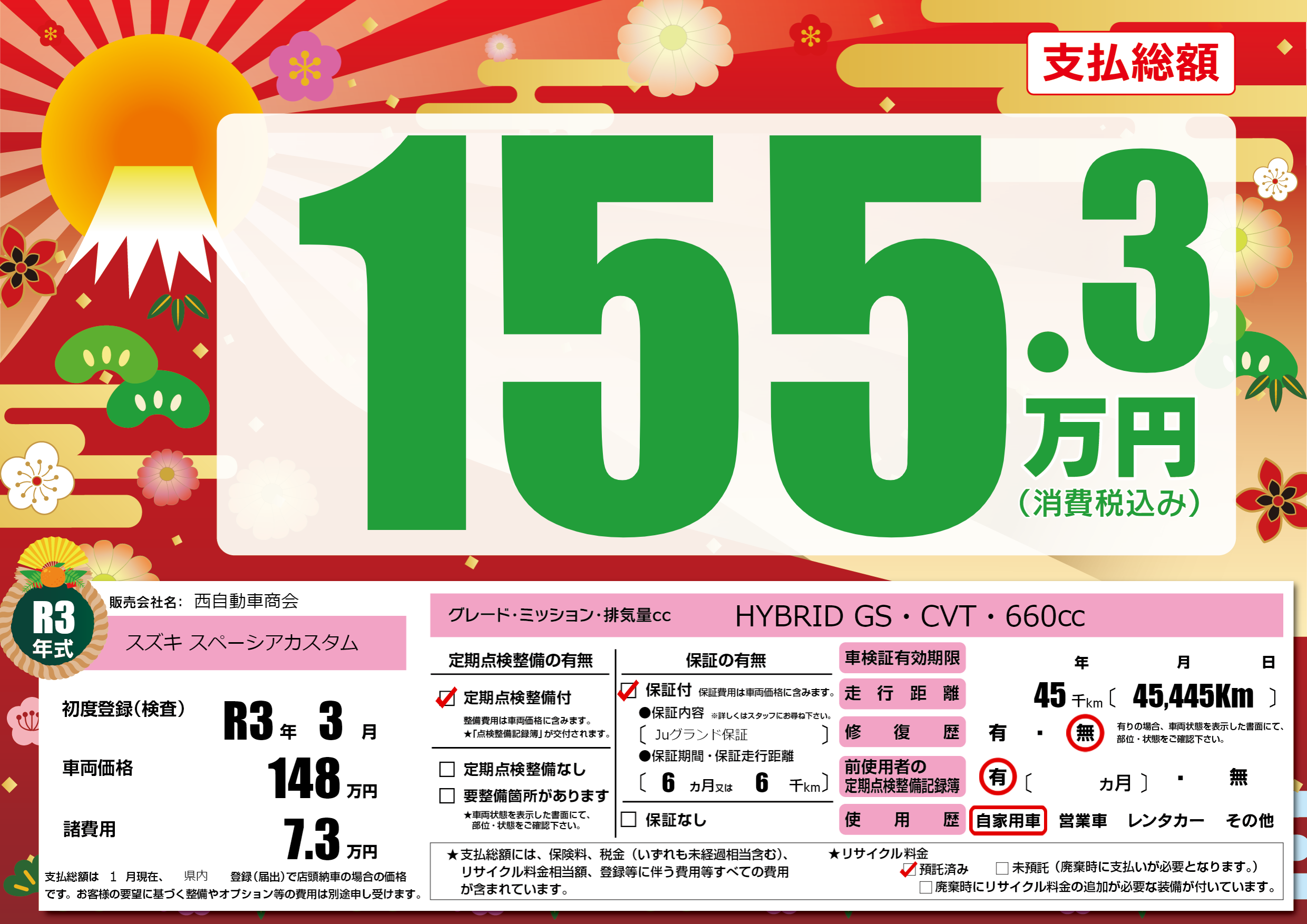 | 車名 | スズキ スペーシアカスタム | グレード ミッション 排気量 |