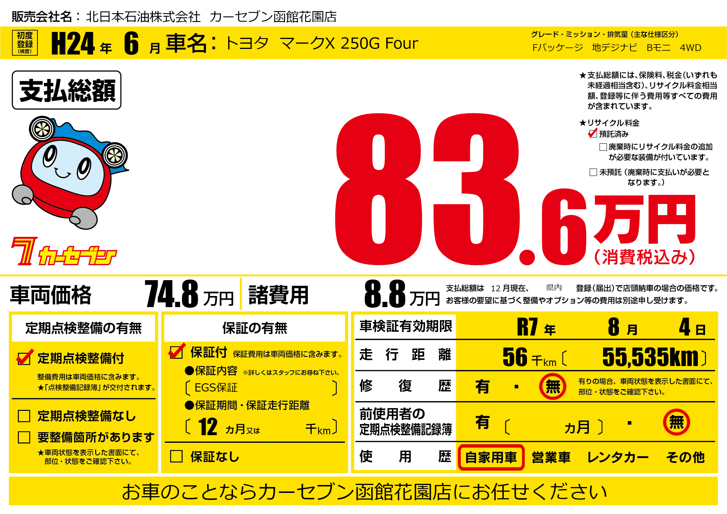 | 車名 | トヨタ マークX 250G Four | グレード ミッション 排気量 |