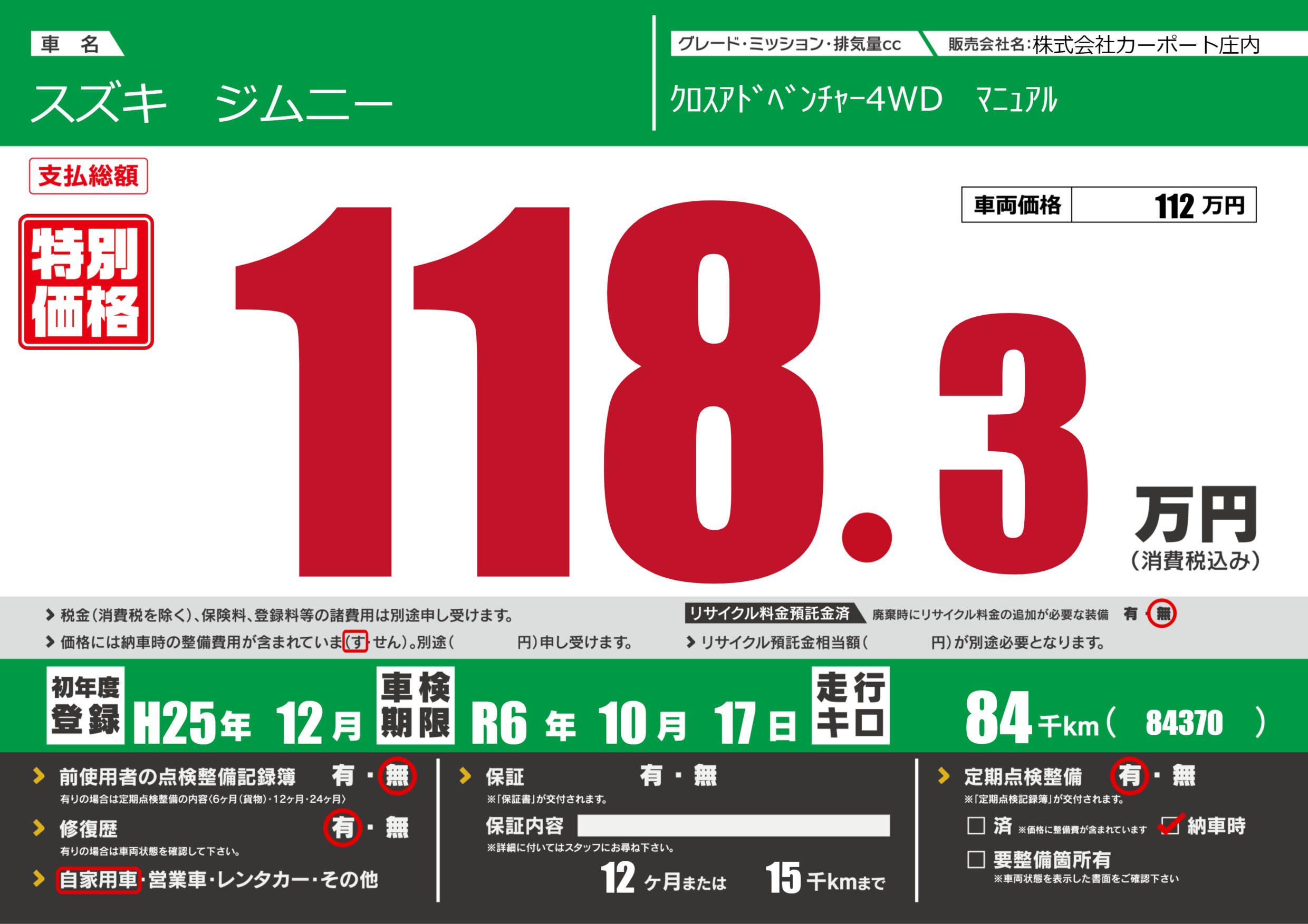 | 定期点検整備 | 定期点検整備あり 納車時あり | ||