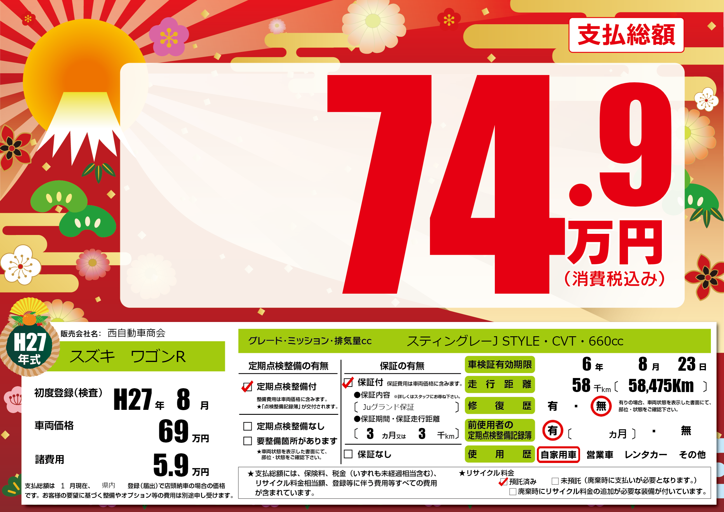 | 走行キロ | 5.8万km | 初年度登録 | H27年8月 |