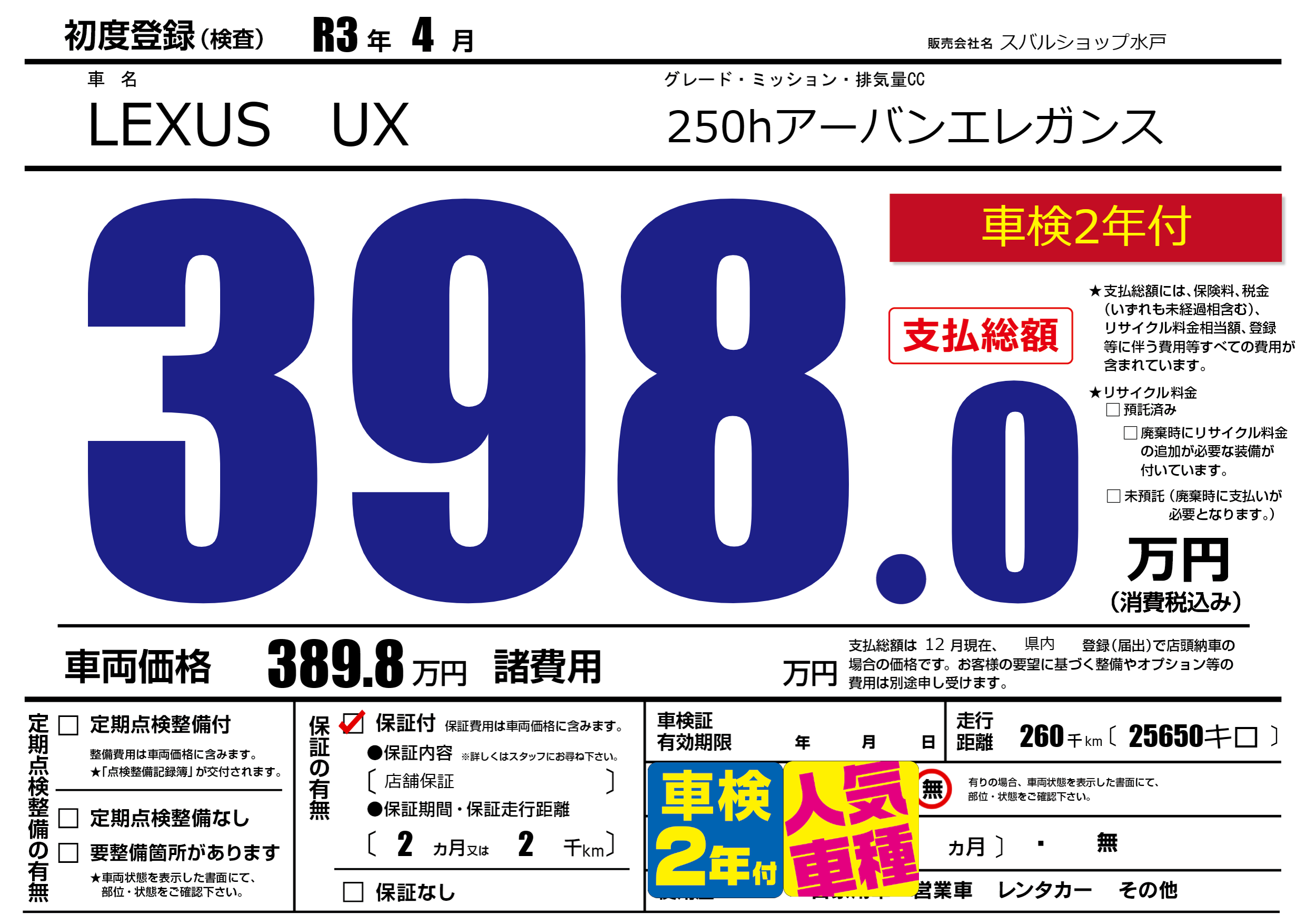 保証付き 保証内容(店舗保証) 2ヶ月または(2)千kmまで |