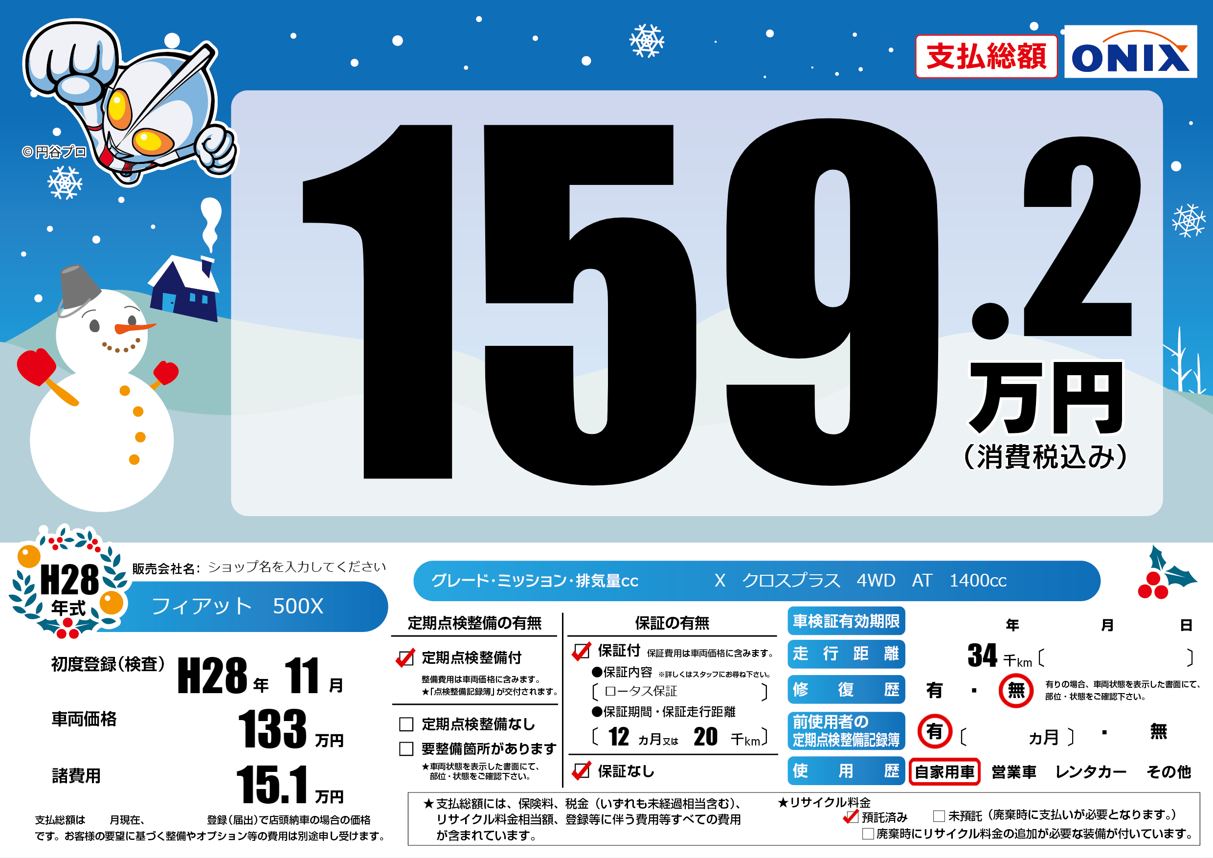 | 車名 | フィアット 500X | グレード ミッション 排気量 |