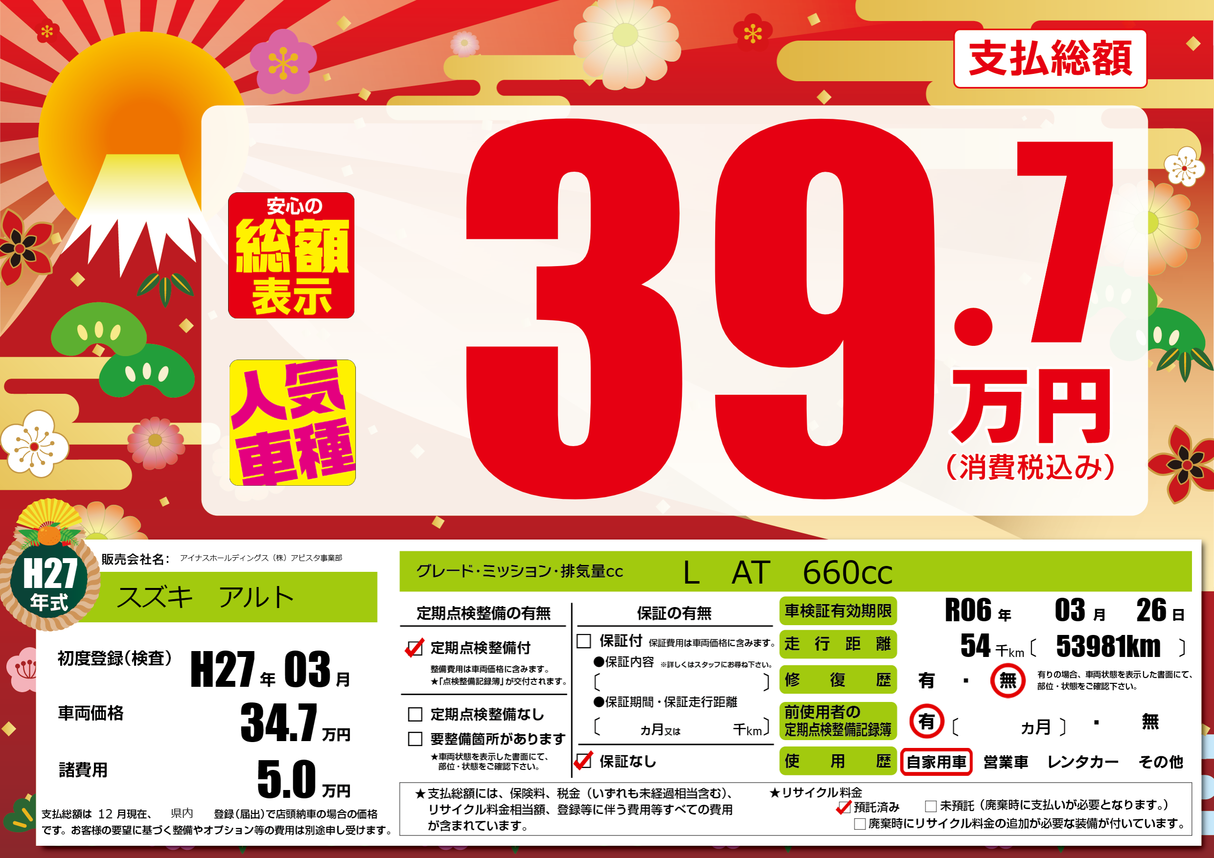 | 車名 | スズキ アルト | グレード ミッション 排気量 |