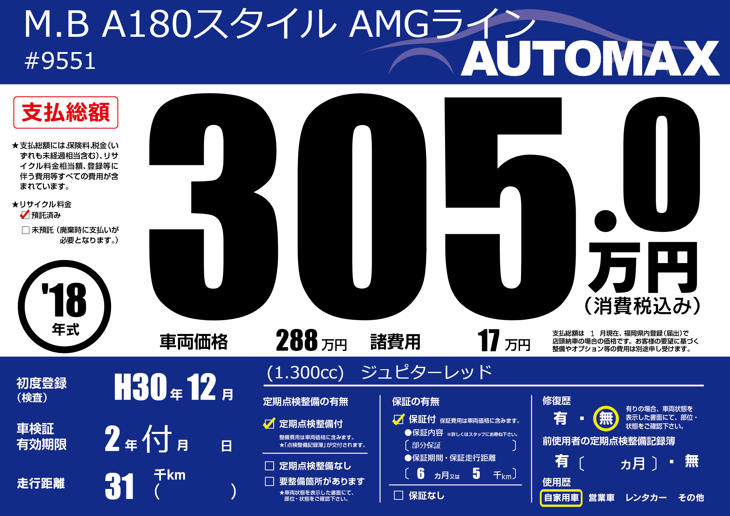 | 車名 | M.B A180スタイル AMGライン | グレード ミッション 排気量 |
