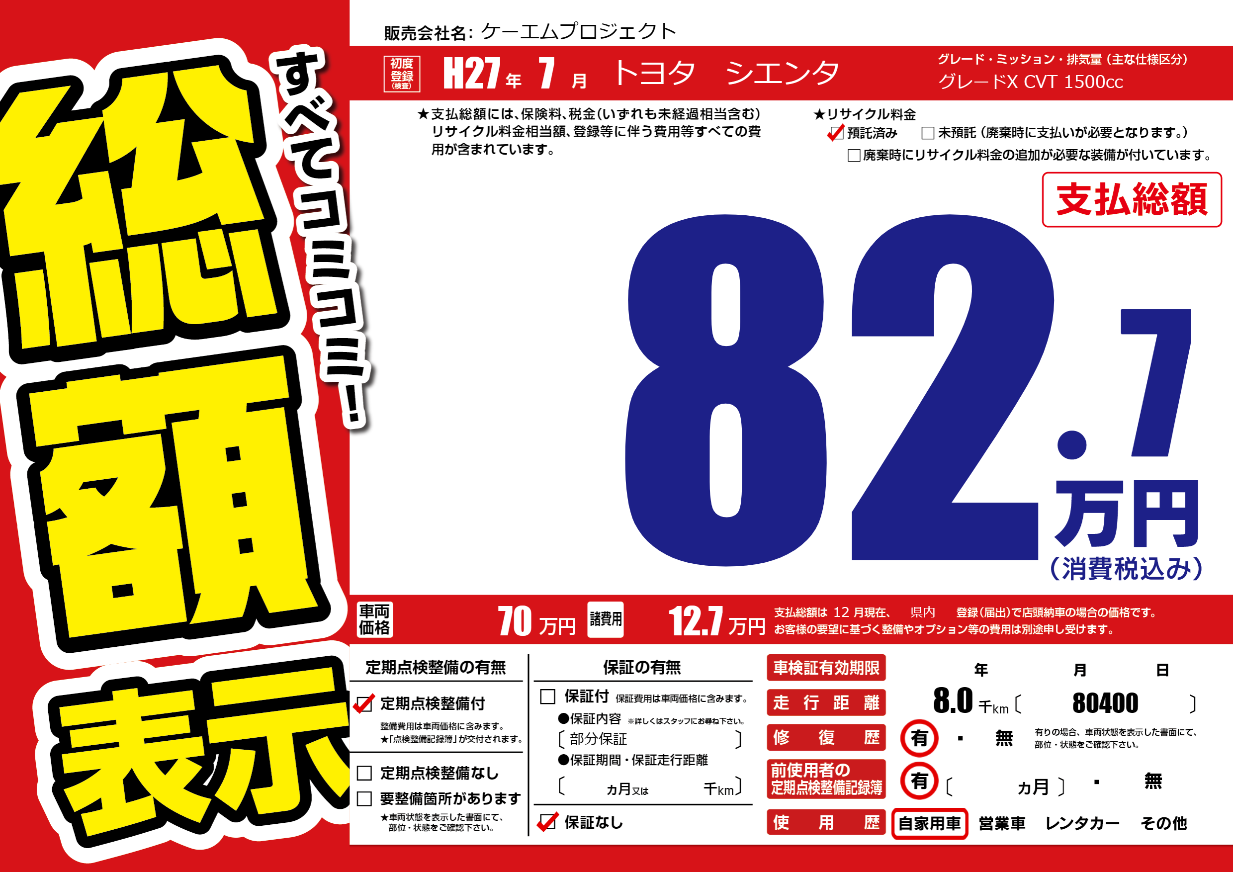 | 車名 | トヨタ シエンタ | グレード ミッション 排気量 |