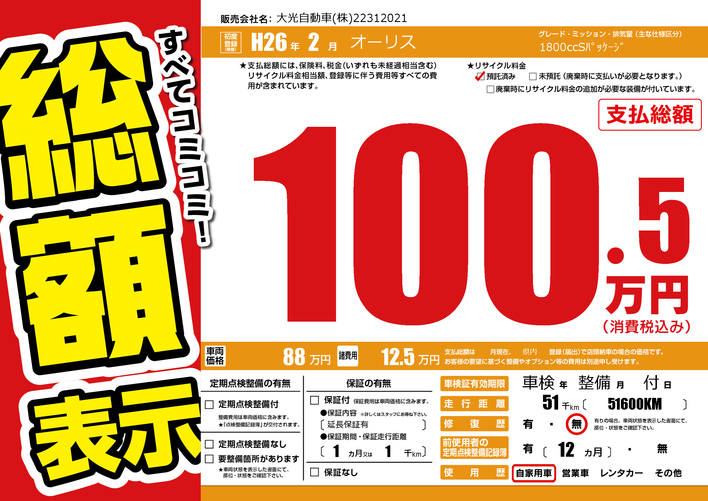 | 車名 | オーリス | グレード ミッション 排気量 |