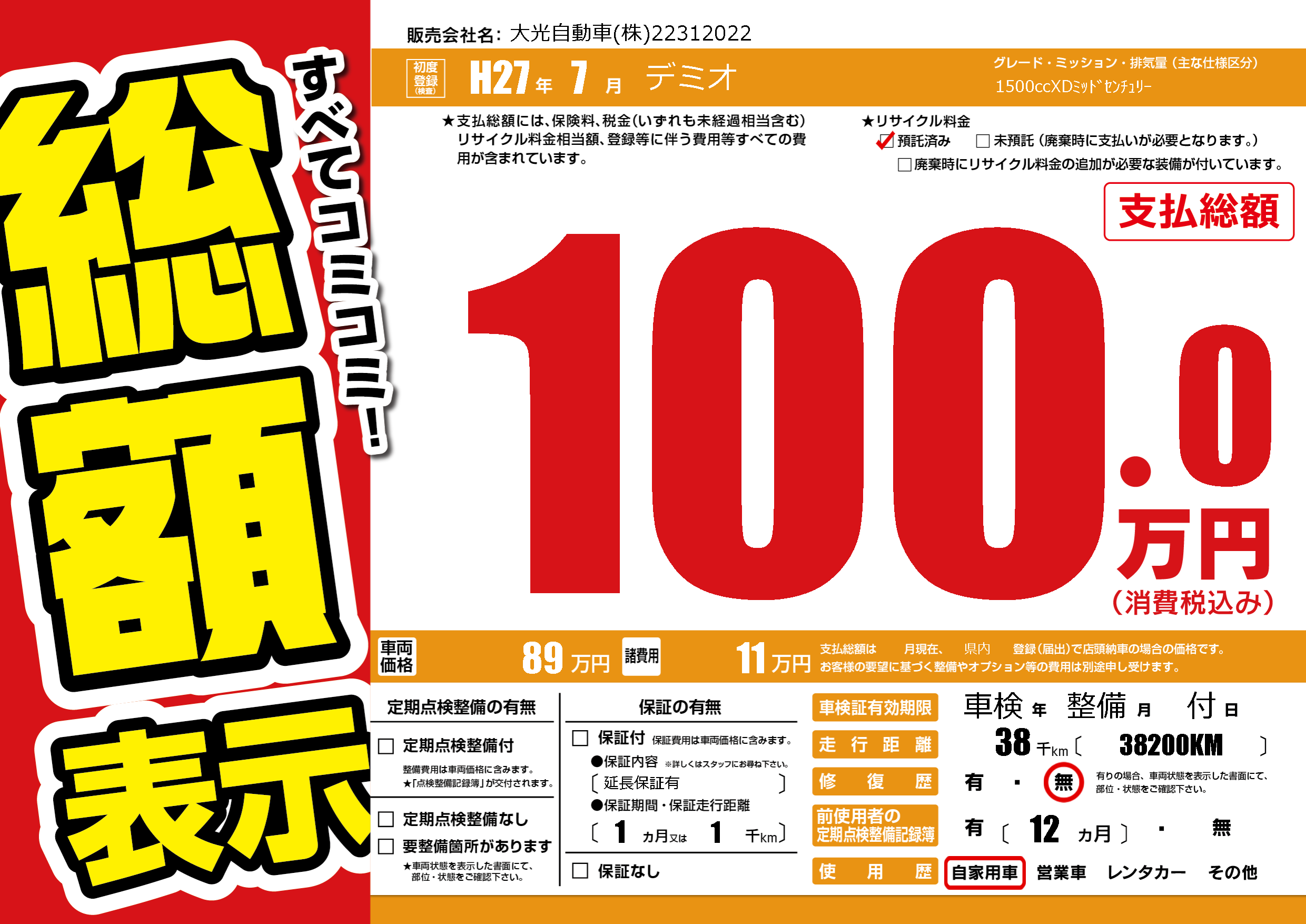| 車名 | デミオ | グレード ミッション 排気量 |