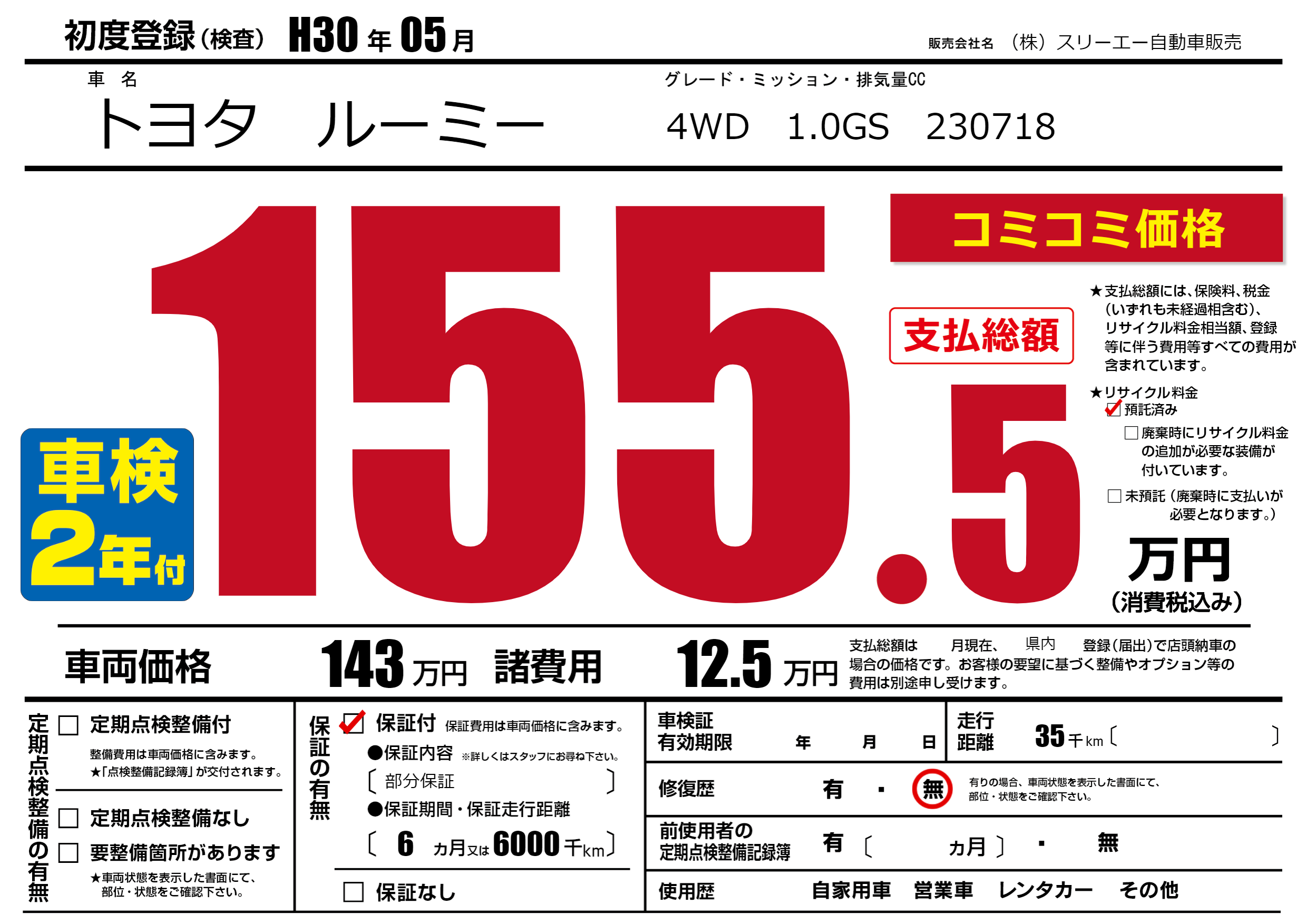 | 車名 | トヨタ ルーミー | グレード ミッション 排気量 |