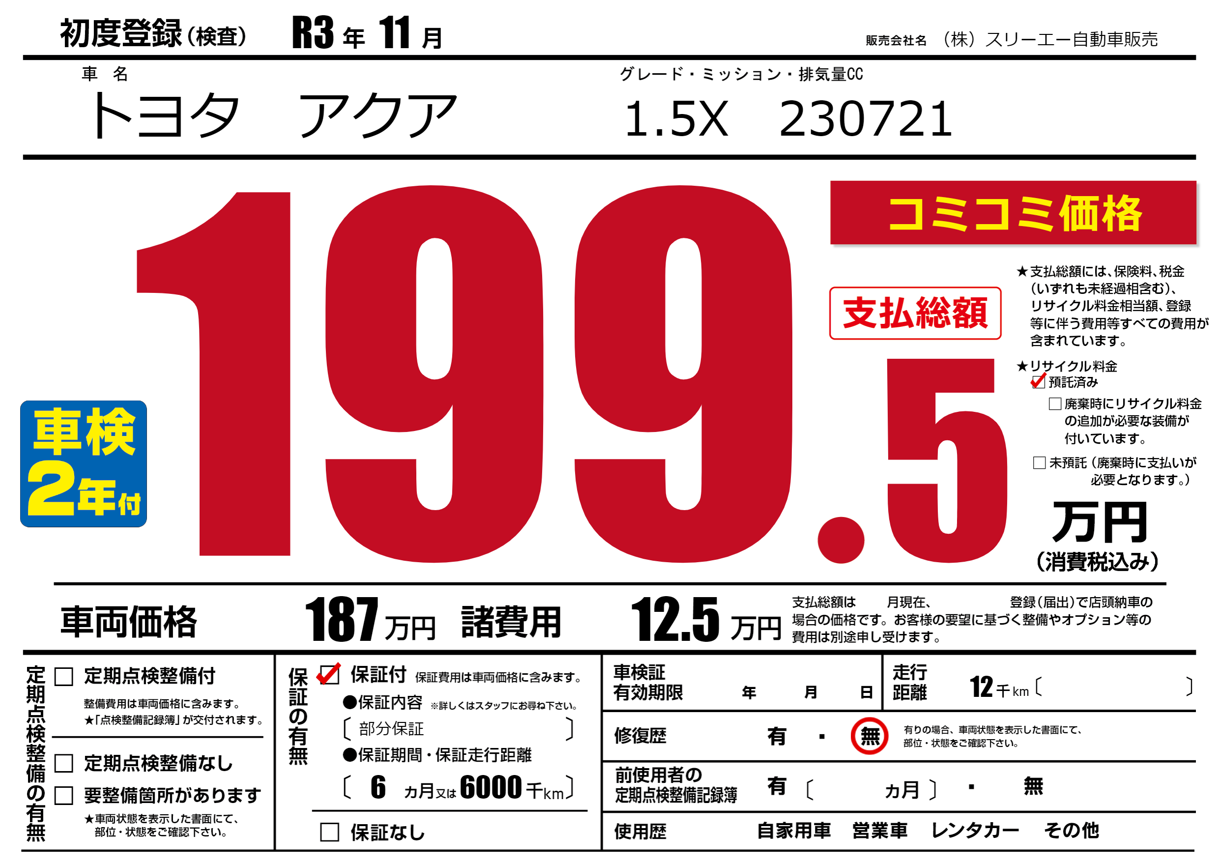 保証付き 保証内容(部分保証) 6ヶ月または(6000)千kmまで |