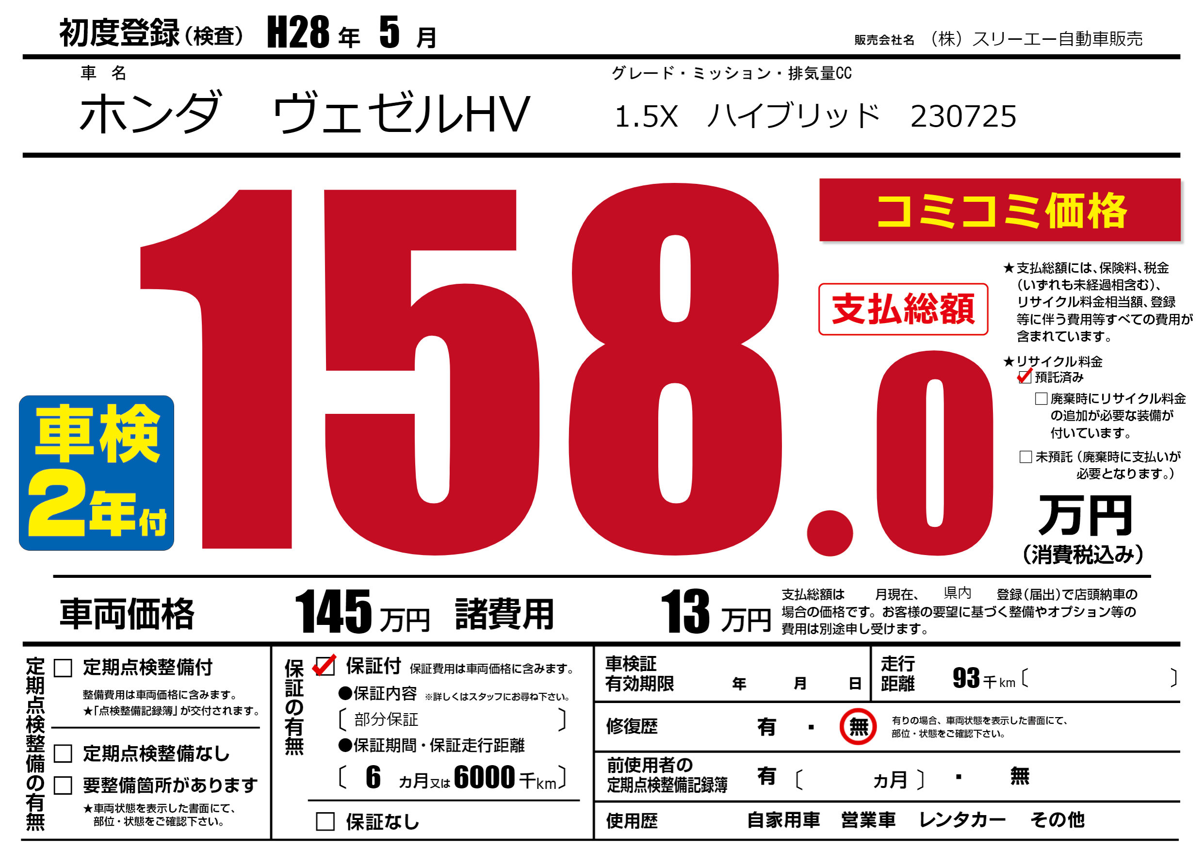 保証付き 保証内容(部分保証) 6ヶ月または(6000)千kmまで |