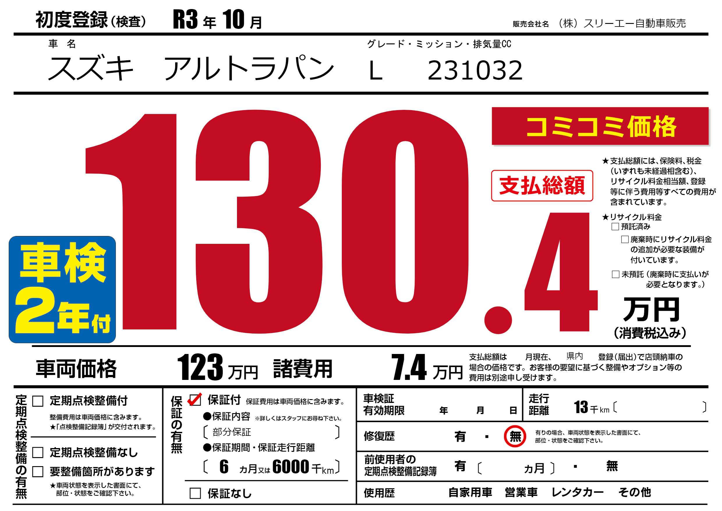 保証付き 保証内容(部分保証) 6ヶ月または(6000)千kmまで |