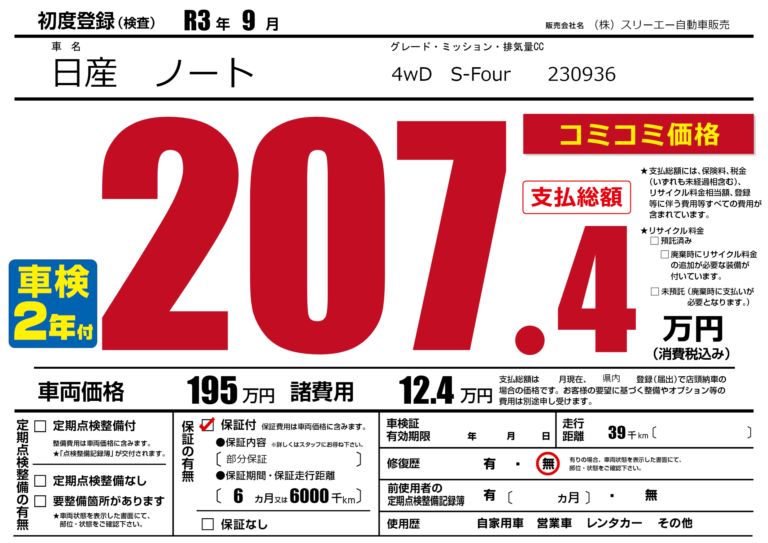 保証付き 保証内容(部分保証) 6ヶ月または(6000)千kmまで |