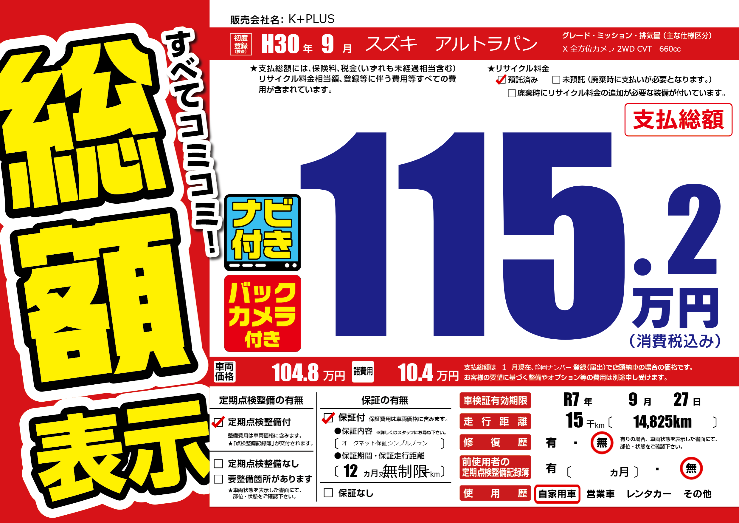 | 走行キロ | 1.5万km | 初年度登録 | H30年9月 |