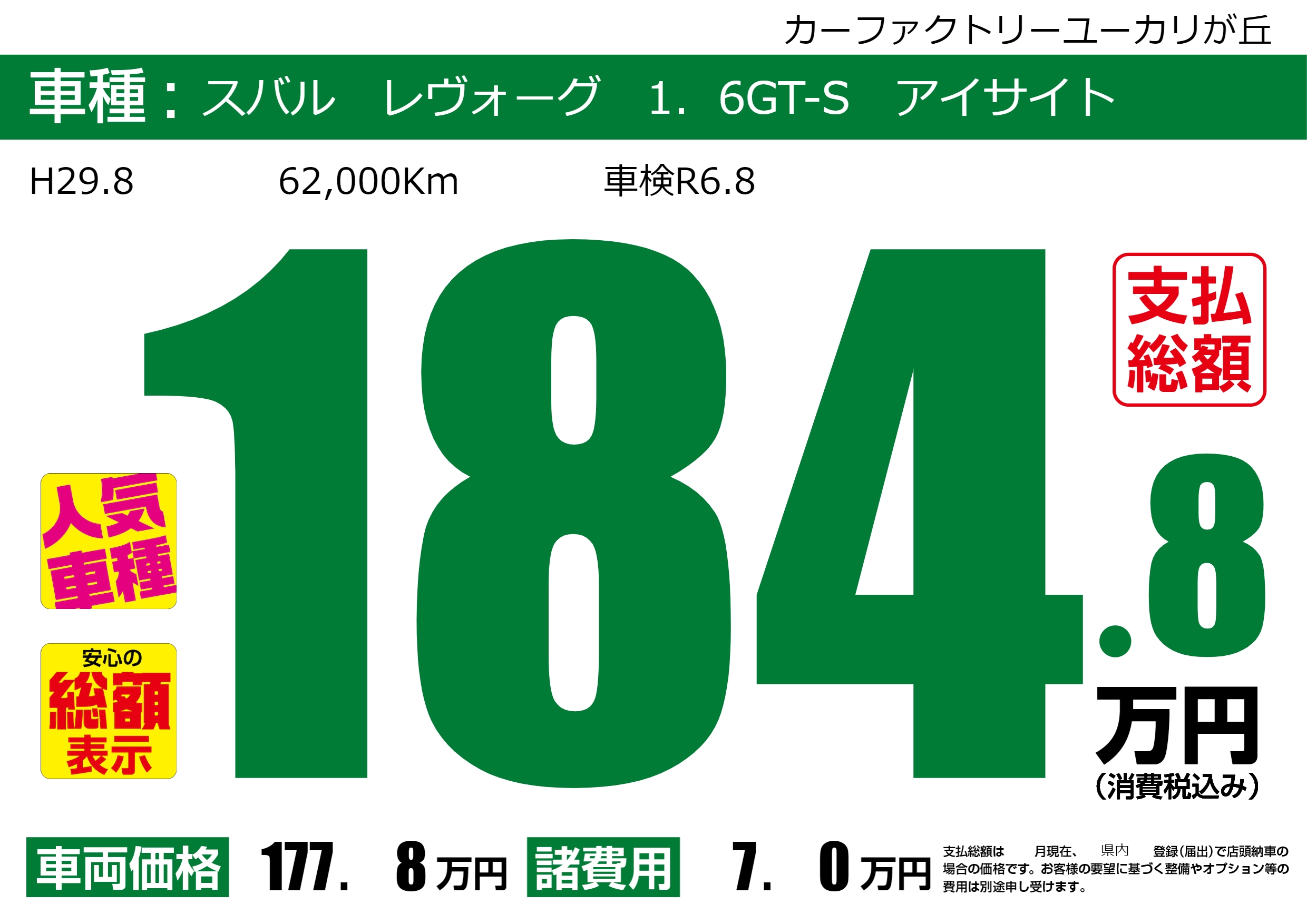 | 車名 | スバル レヴォーグ 1.6GT-S アイサイト | グレード ミッション 排気量 |