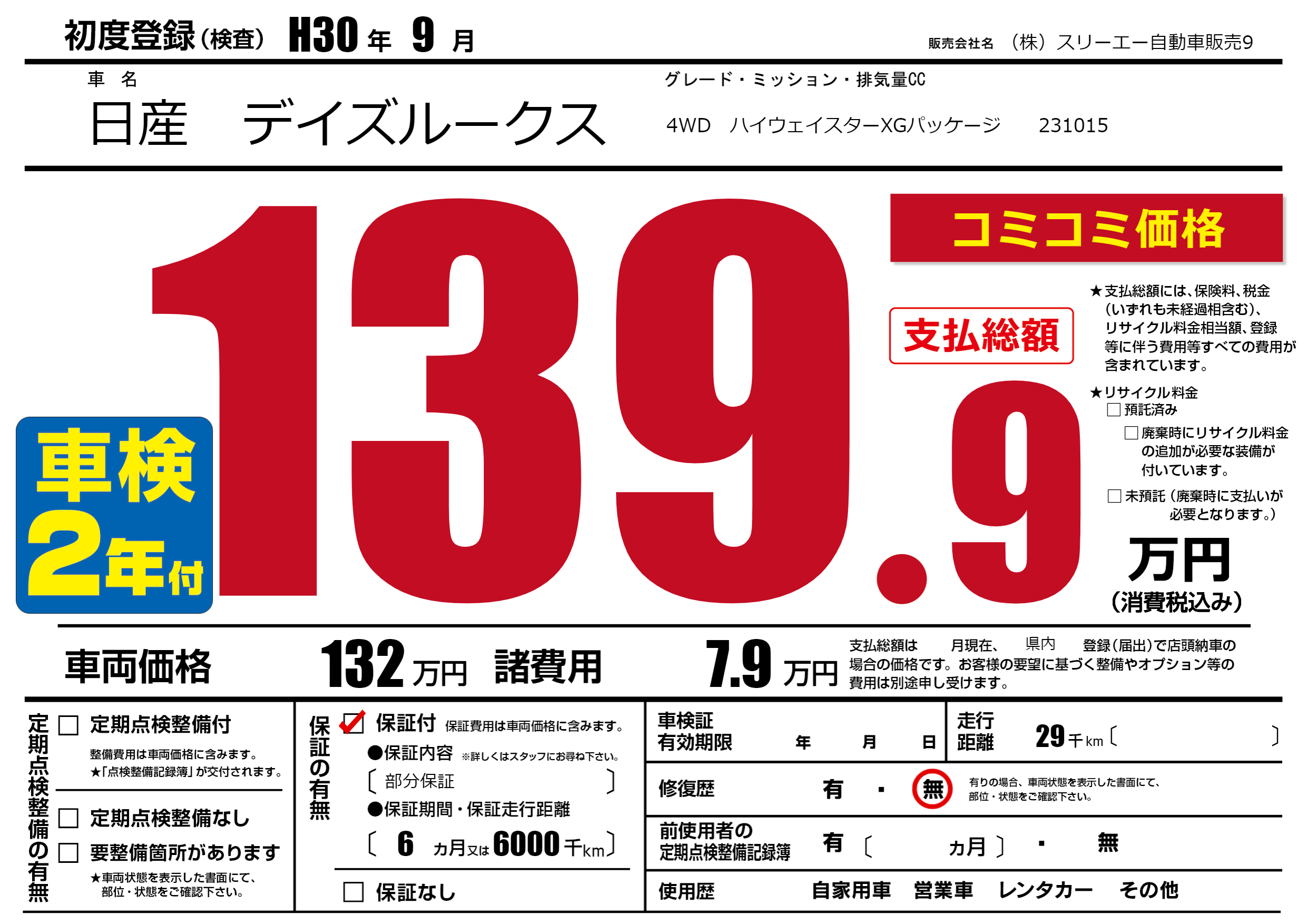 保証付き 保証内容(部分保証) 6ヶ月または(6000)千kmまで |