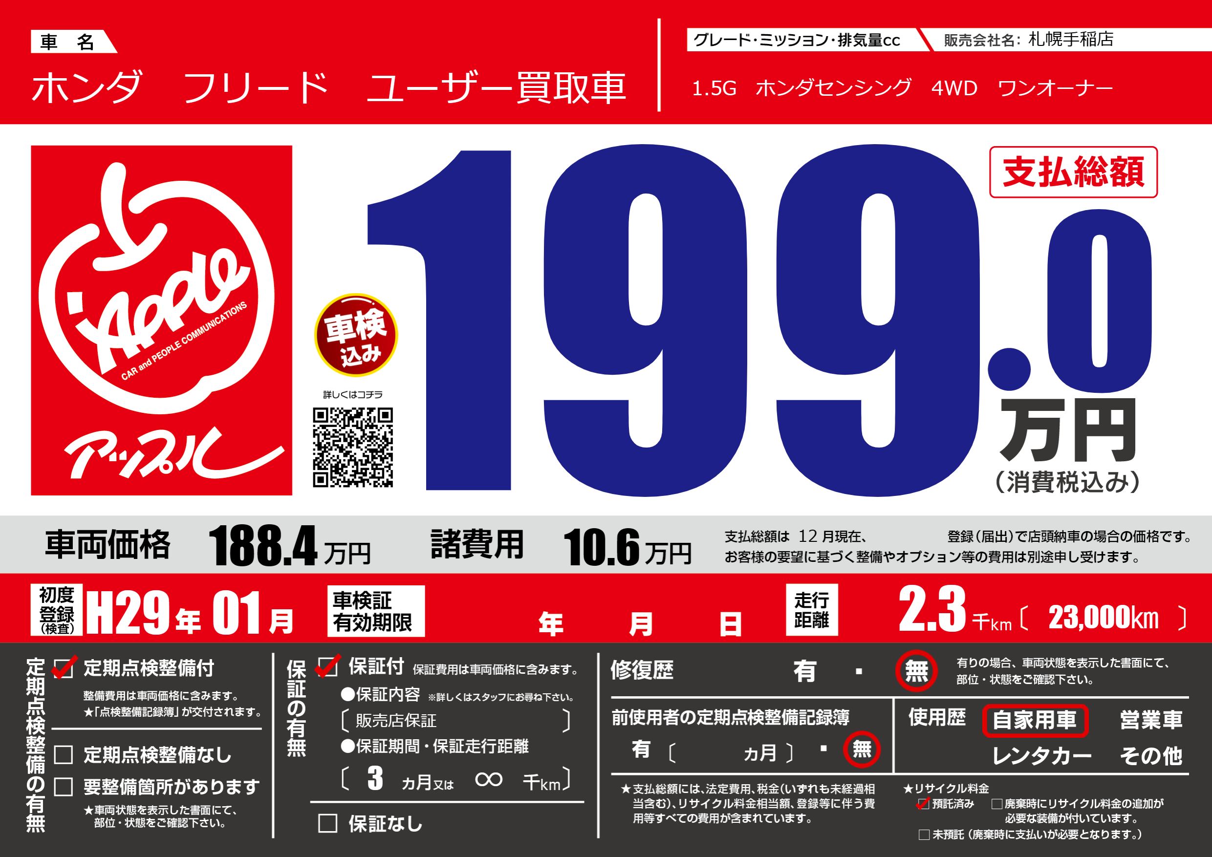 | 車名 | ホンダ フリード ユーザー買取車 | グレード ミッション 排気量 |
