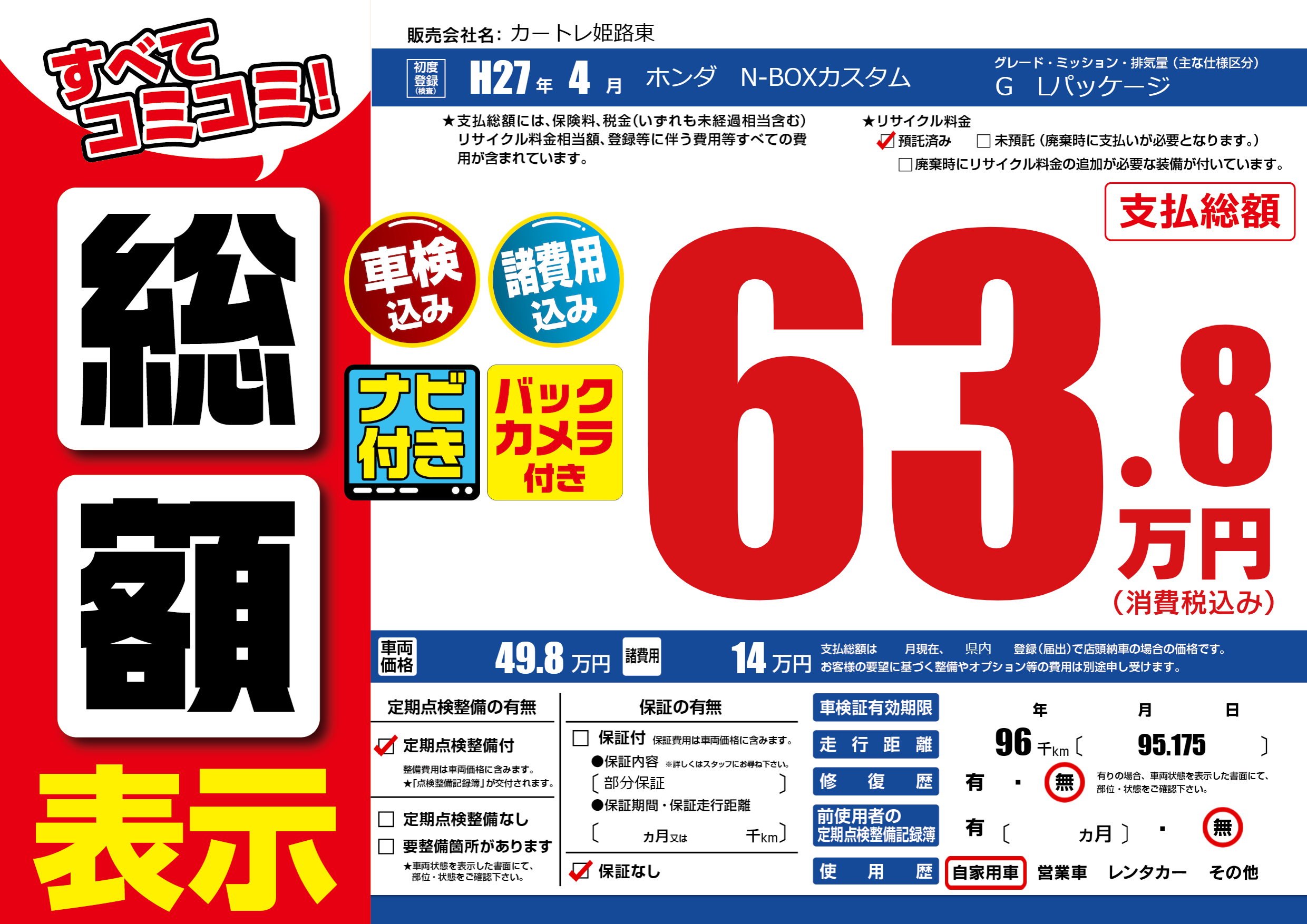 | 車名 | ホンダ N-BOXカスタム | グレード ミッション 排気量 |