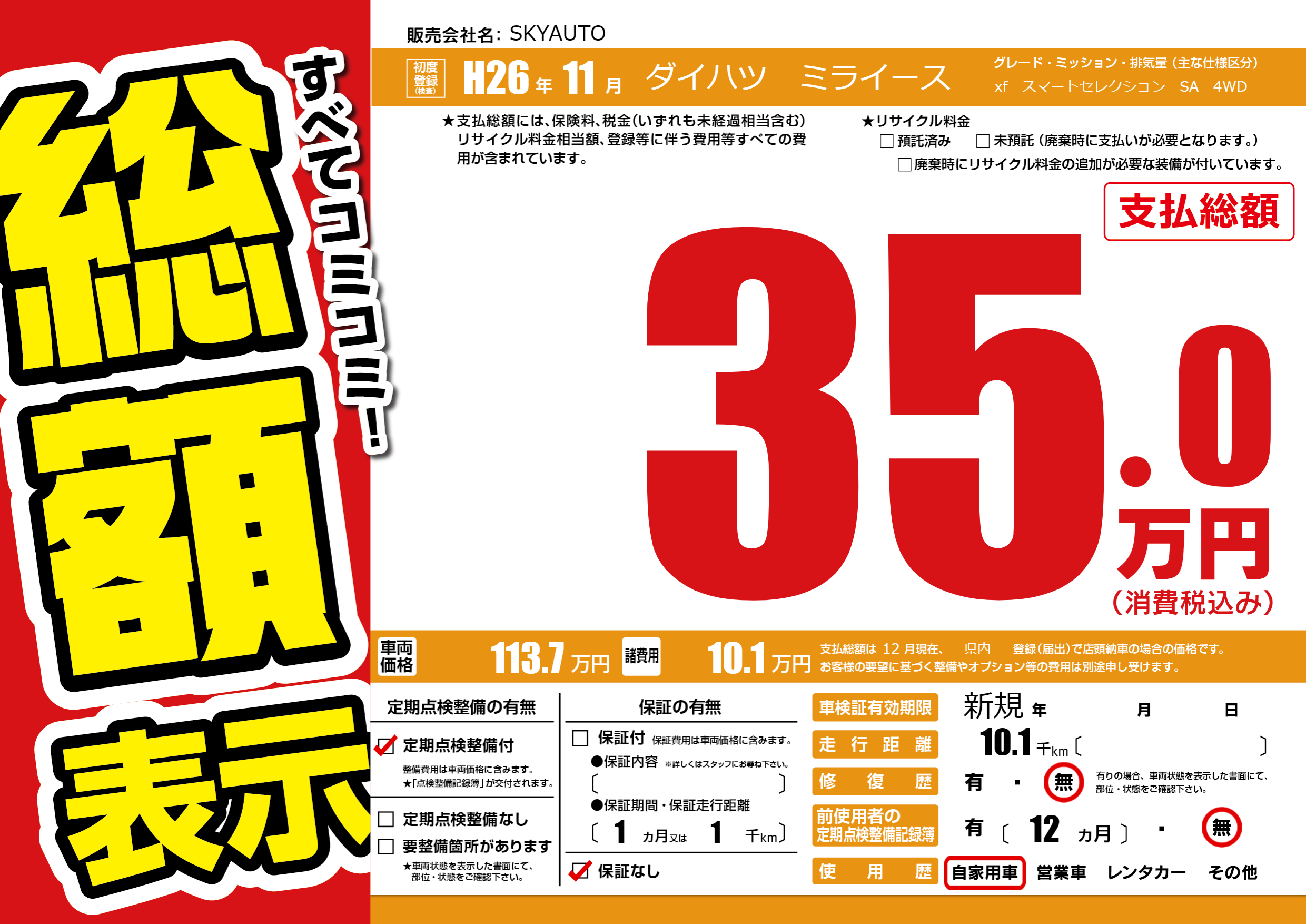 | 走行キロ | 1万km | 初年度登録 | H26年11月 |