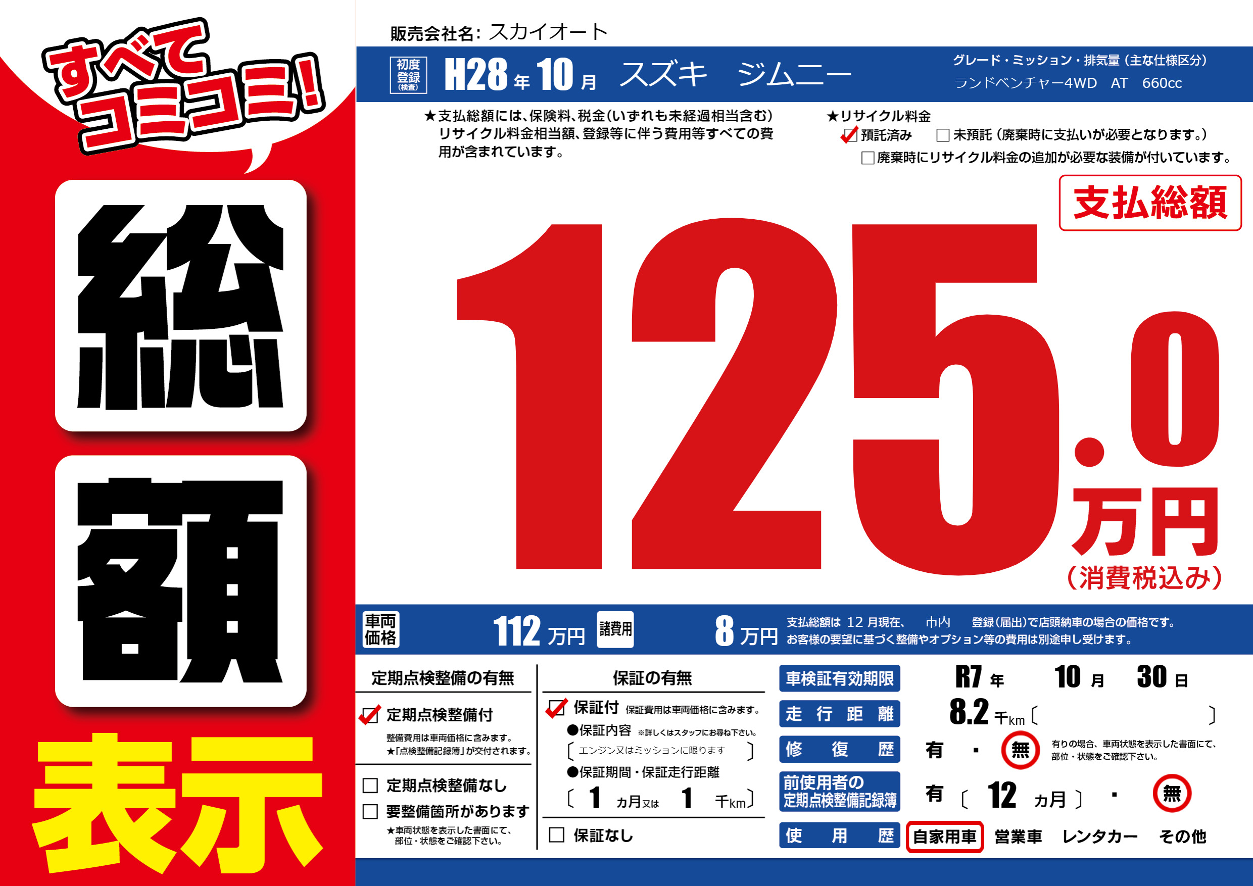 | 走行キロ | 0.8万km | 初年度登録 | H28年10月 |