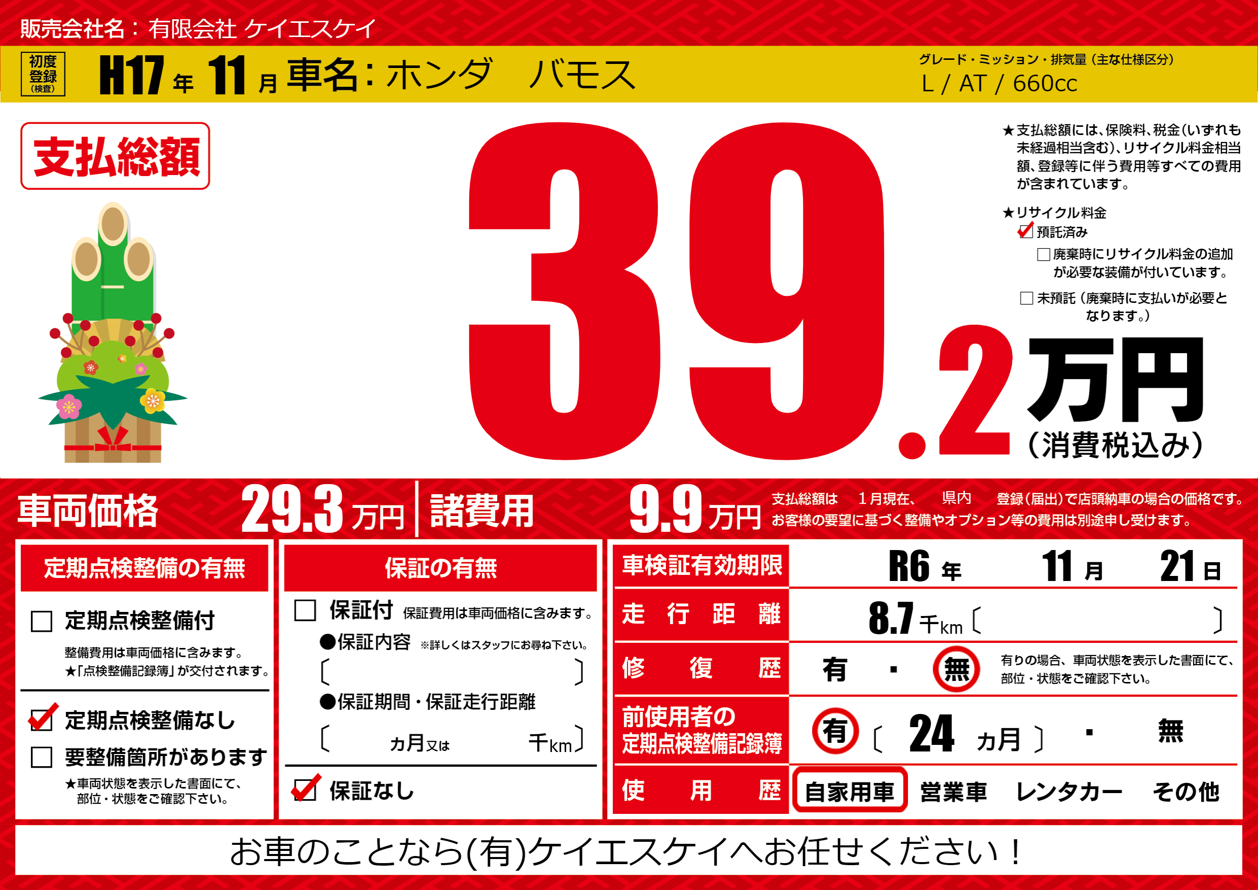 | 車名 | ホンダ バモス | グレード ミッション 排気量 |