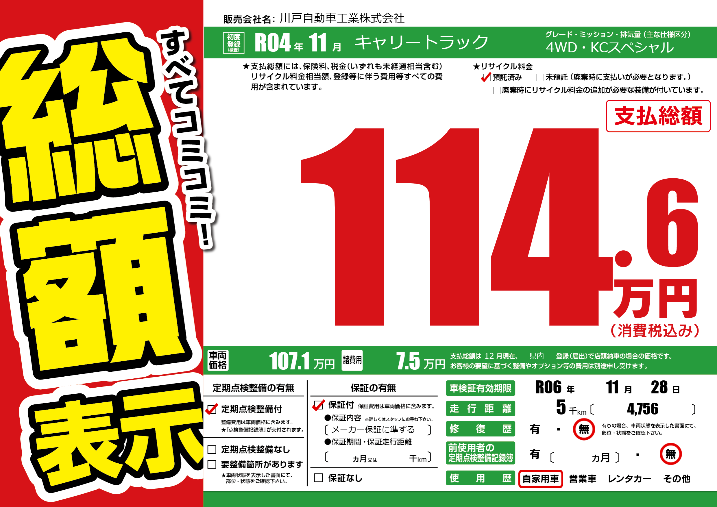 | 車名 | キャリートラック | グレード ミッション 排気量 |