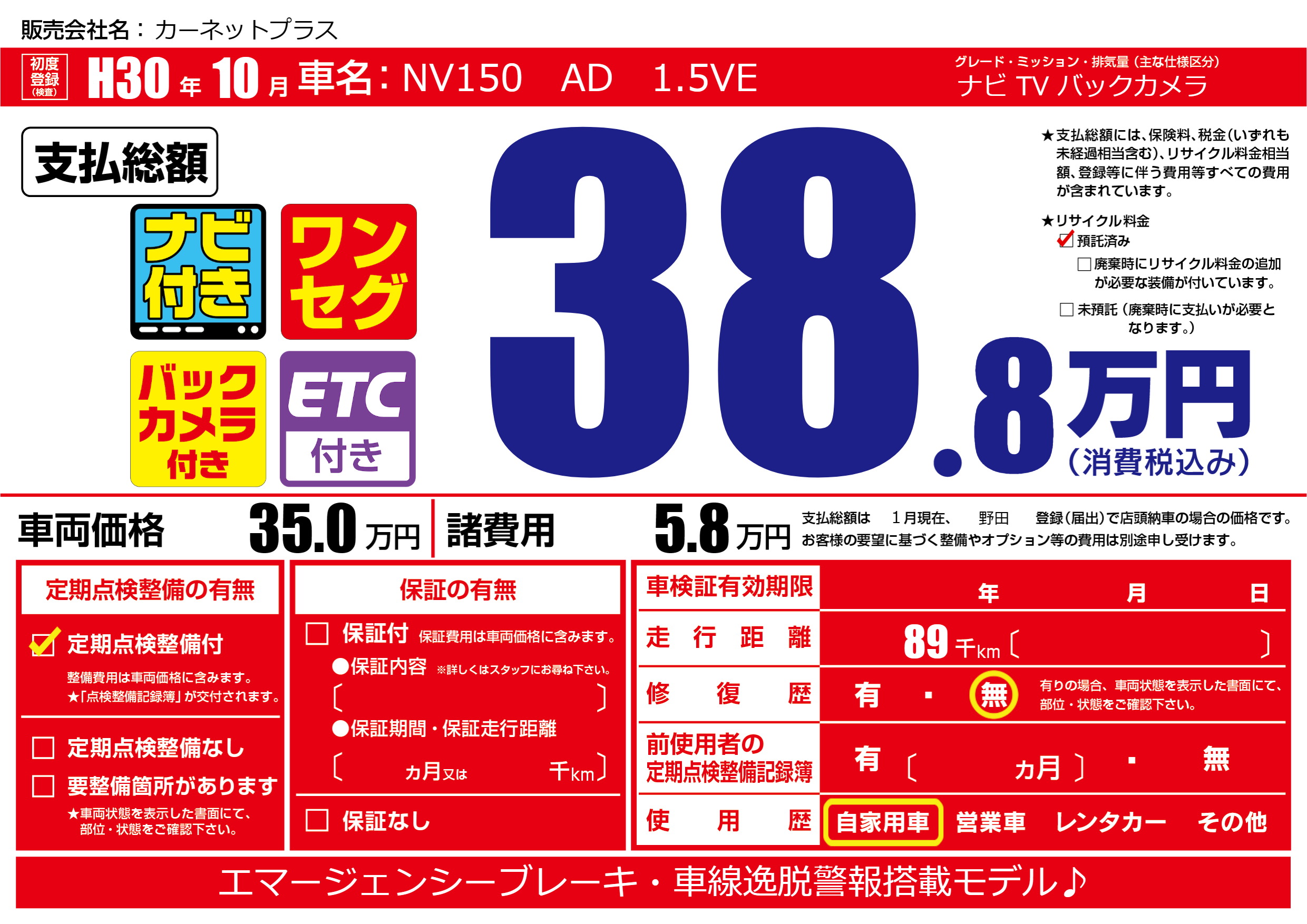 | 車名 | NV150 AD 1.5VE | グレード ミッション 排気量 |