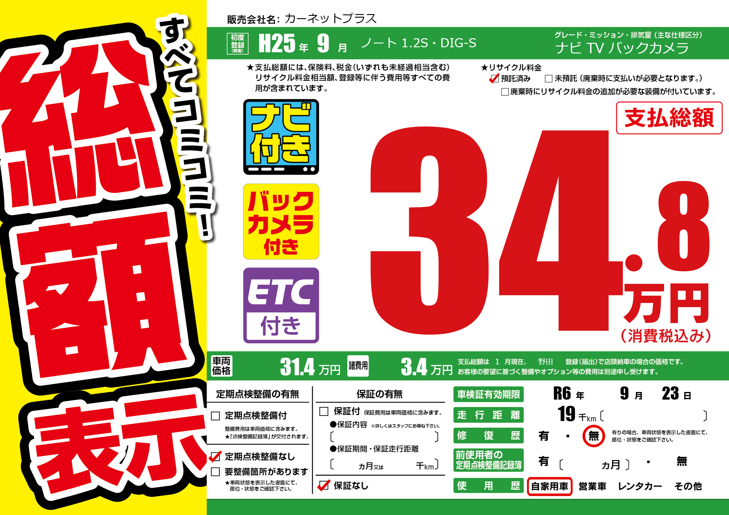 | 車名 | ノート 1.2S・DIG-S | グレード ミッション 排気量 |