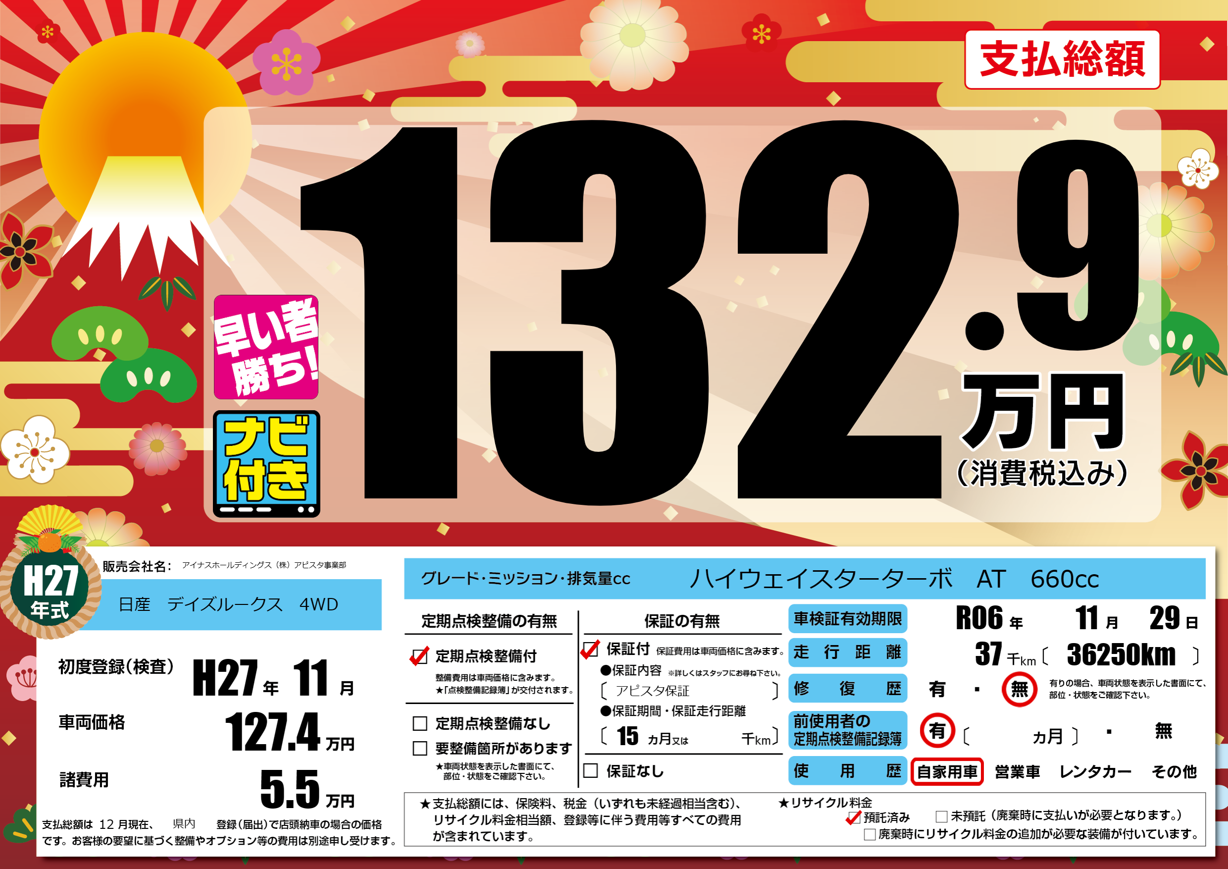 | 車名 | 日産 デイズルークス 4WD | グレード ミッション 排気量 |
