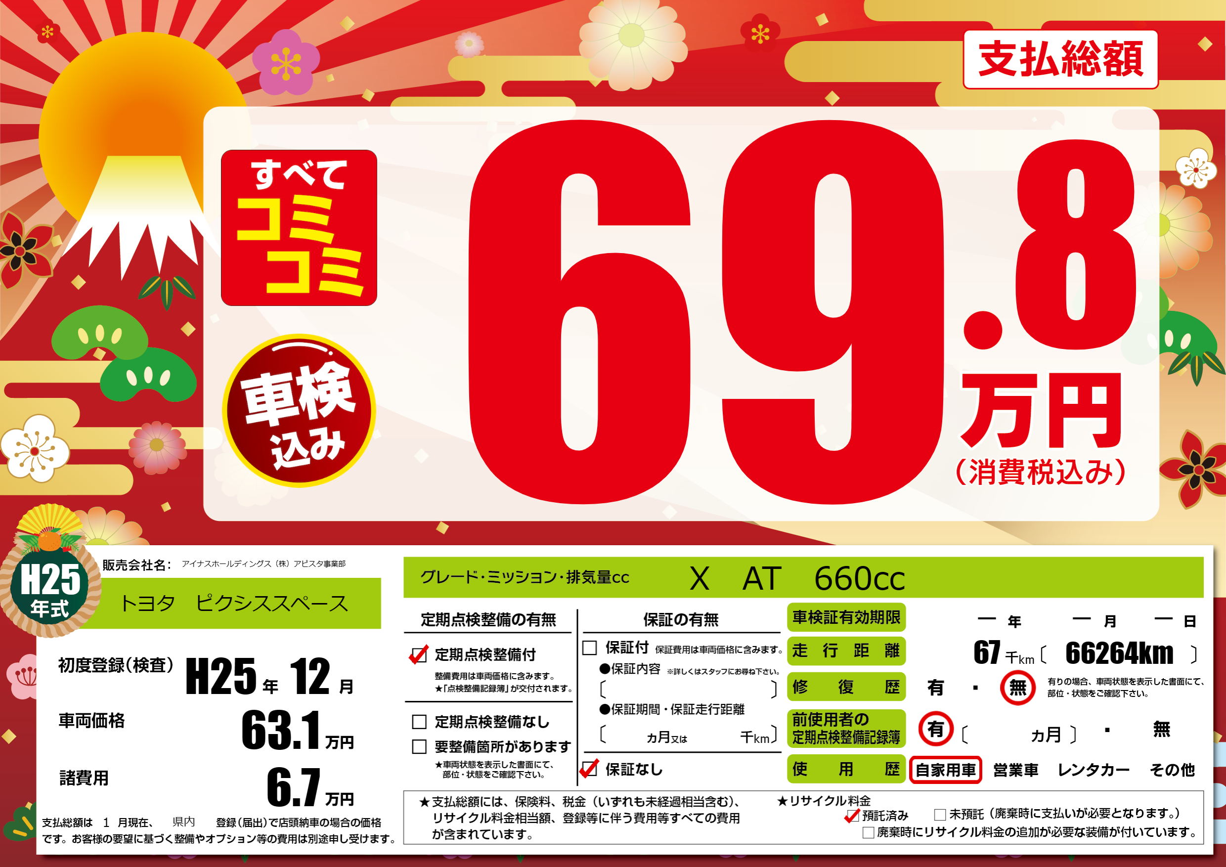 | 車名 | トヨタ ピクシススペース | グレード ミッション 排気量 |