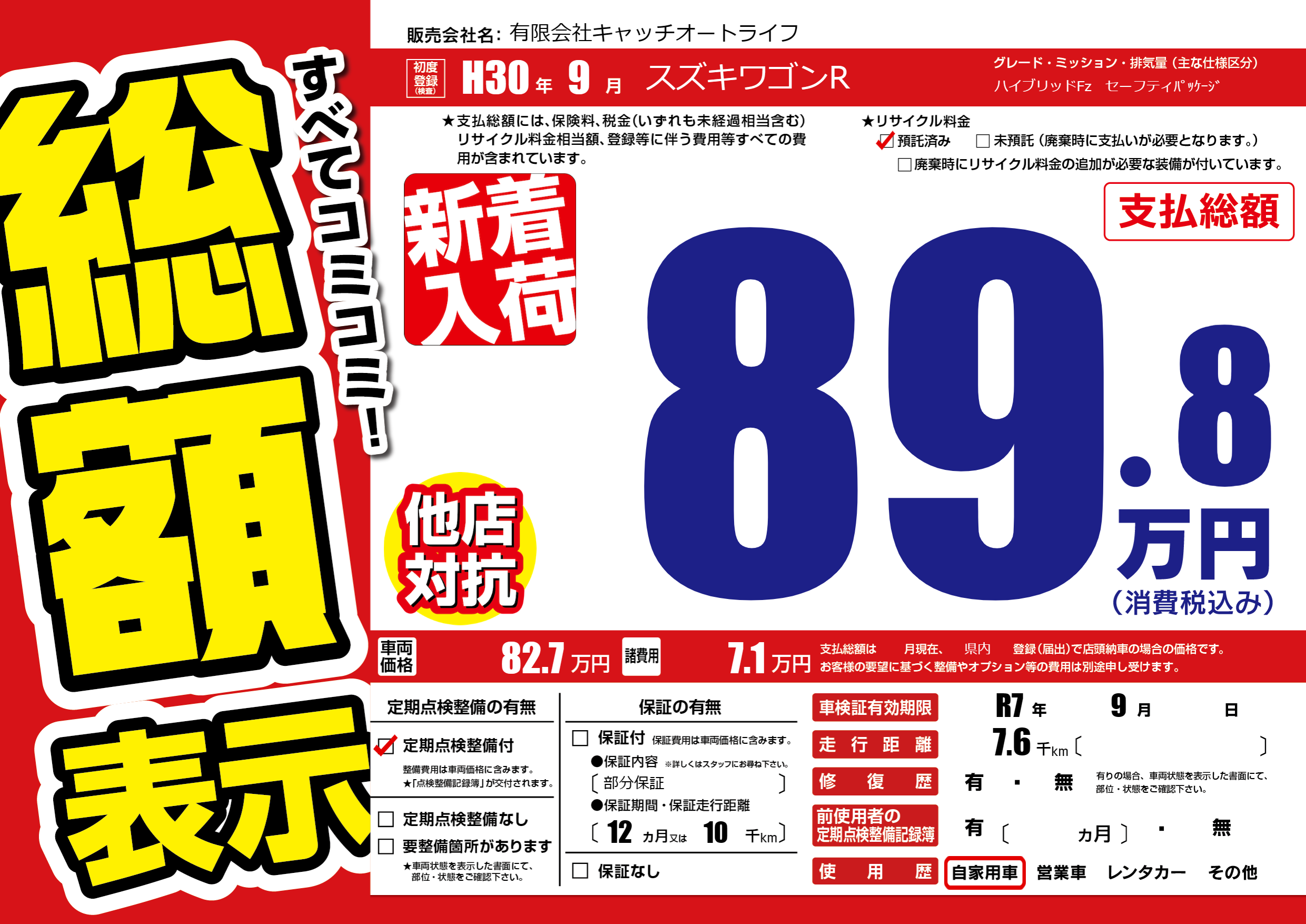 | 車名 | スズキワゴンR | グレード ミッション 排気量 |