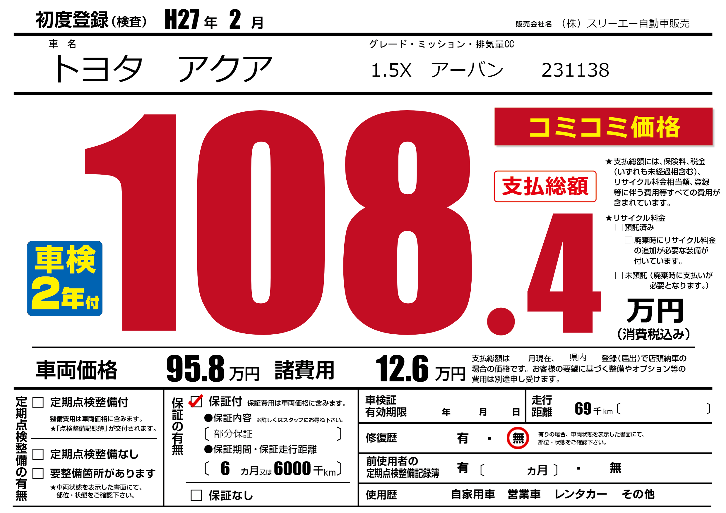 保証付き 保証内容(部分保証) 6ヶ月または(6000)千kmまで |