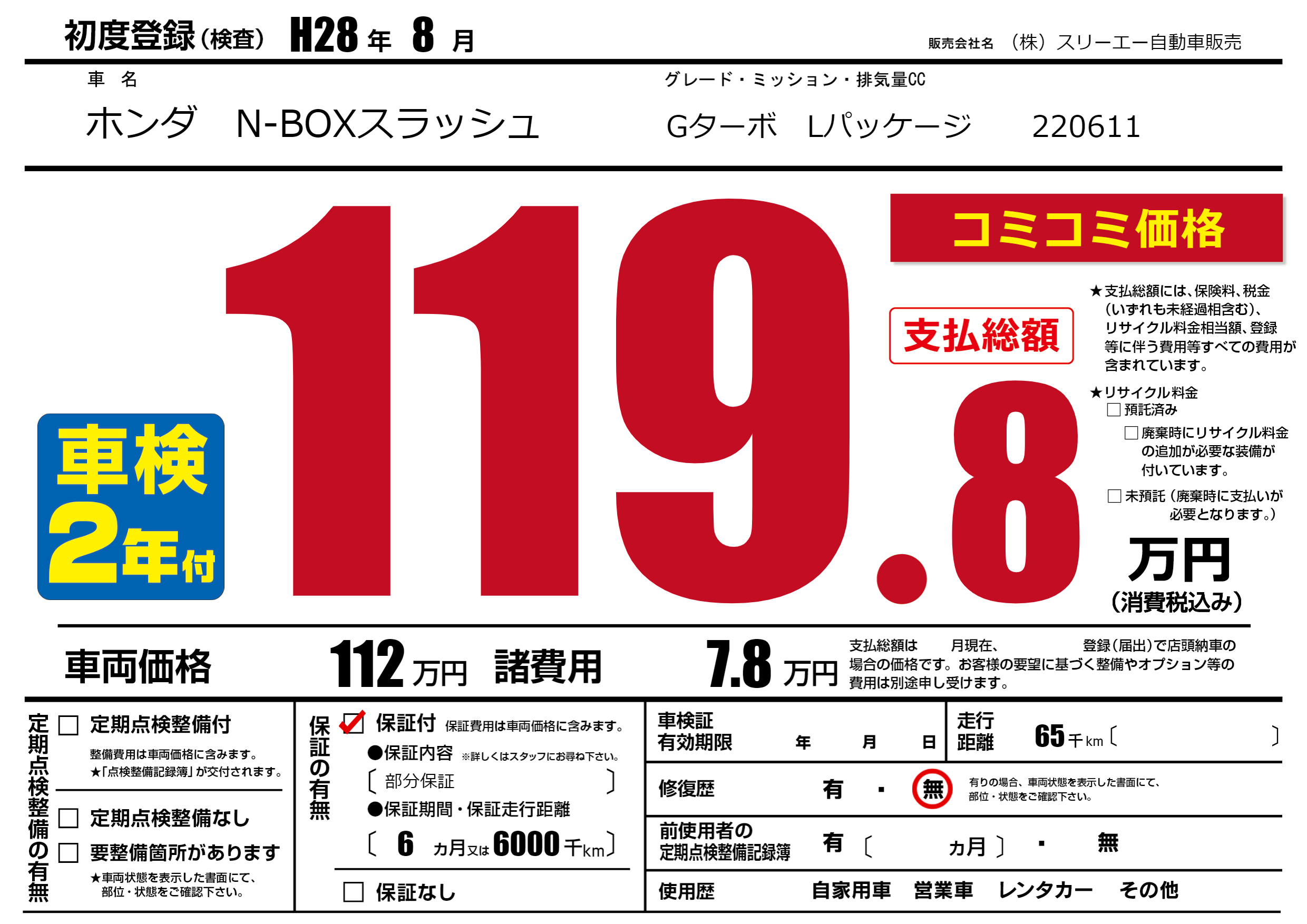 | 走行キロ | 6.5万km | 初年度登録 | H28年8月 |