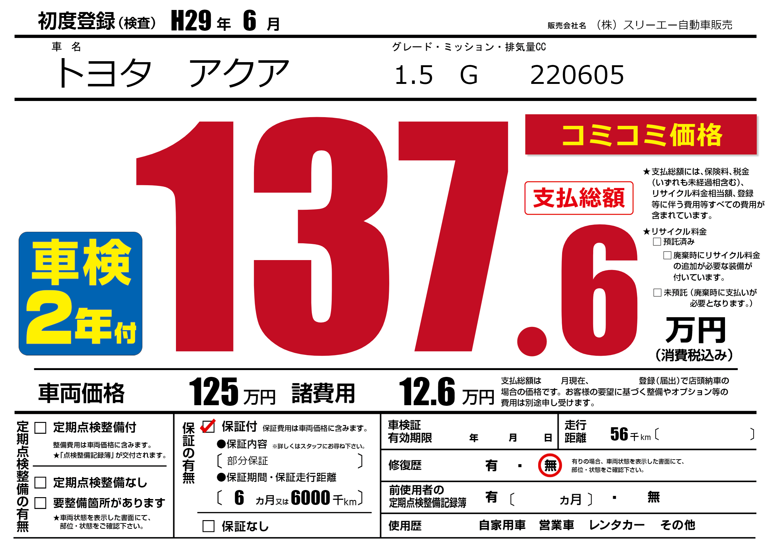 | 走行キロ | 5.6万km | 初年度登録 | H29年6月 |