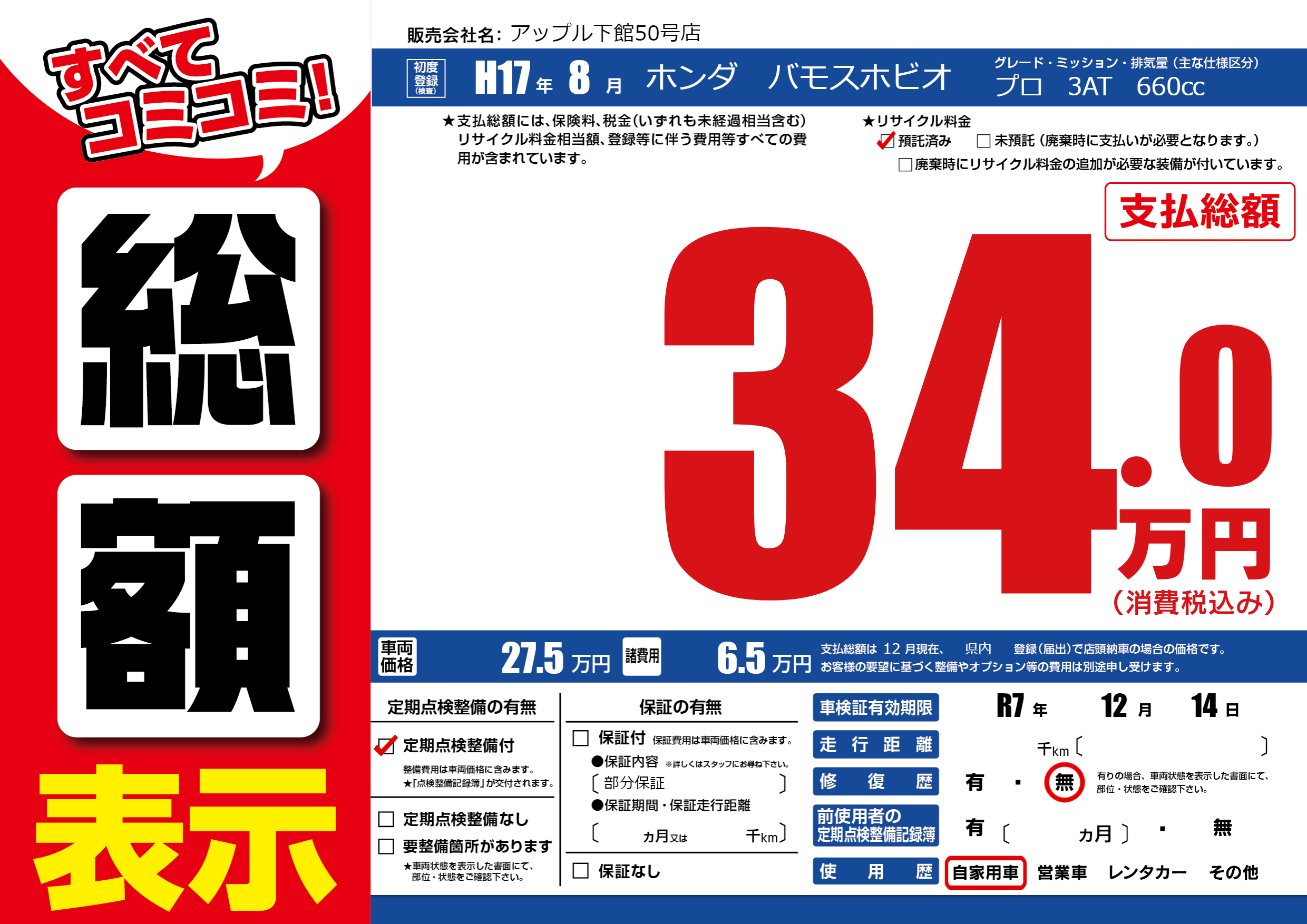 なし | 車検制限 | R7年12月14月 |