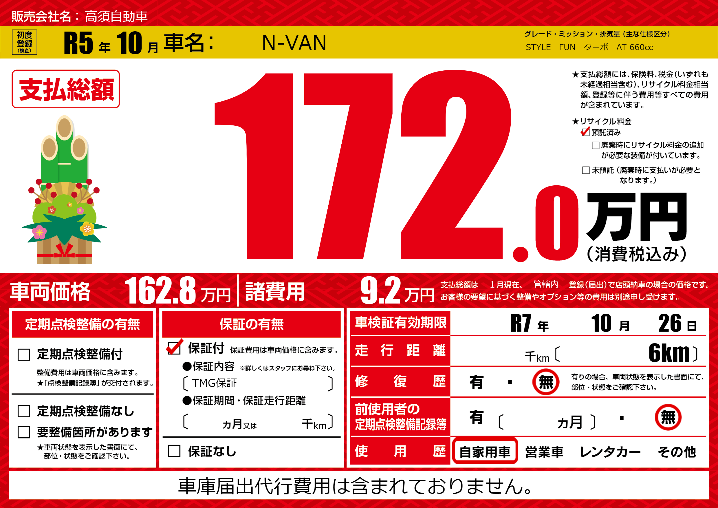 | 車名 | N-VAN | グレード ミッション 排気量 |
