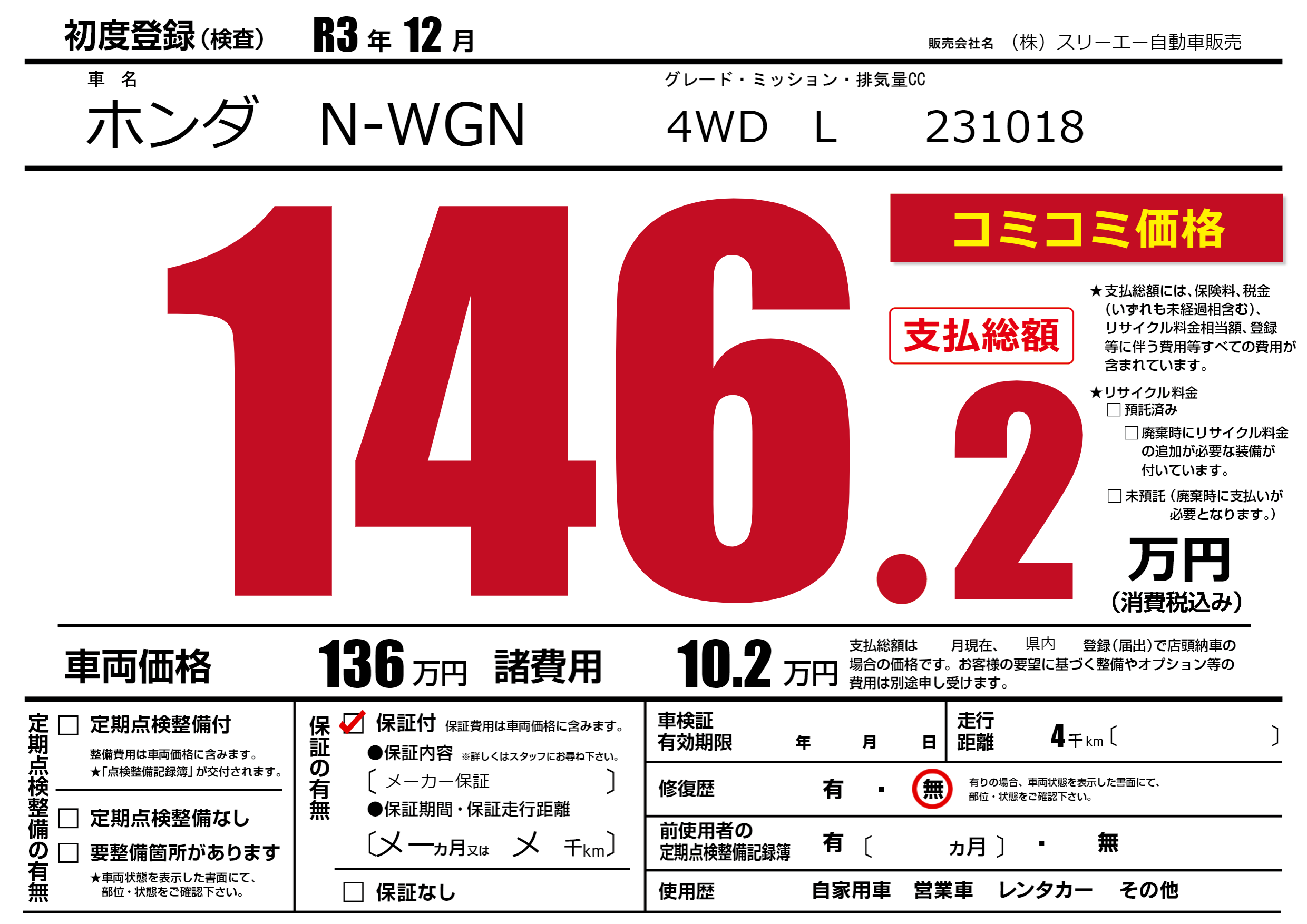 | 車名 | ホンダ N-WGN | グレード ミッション 排気量 |