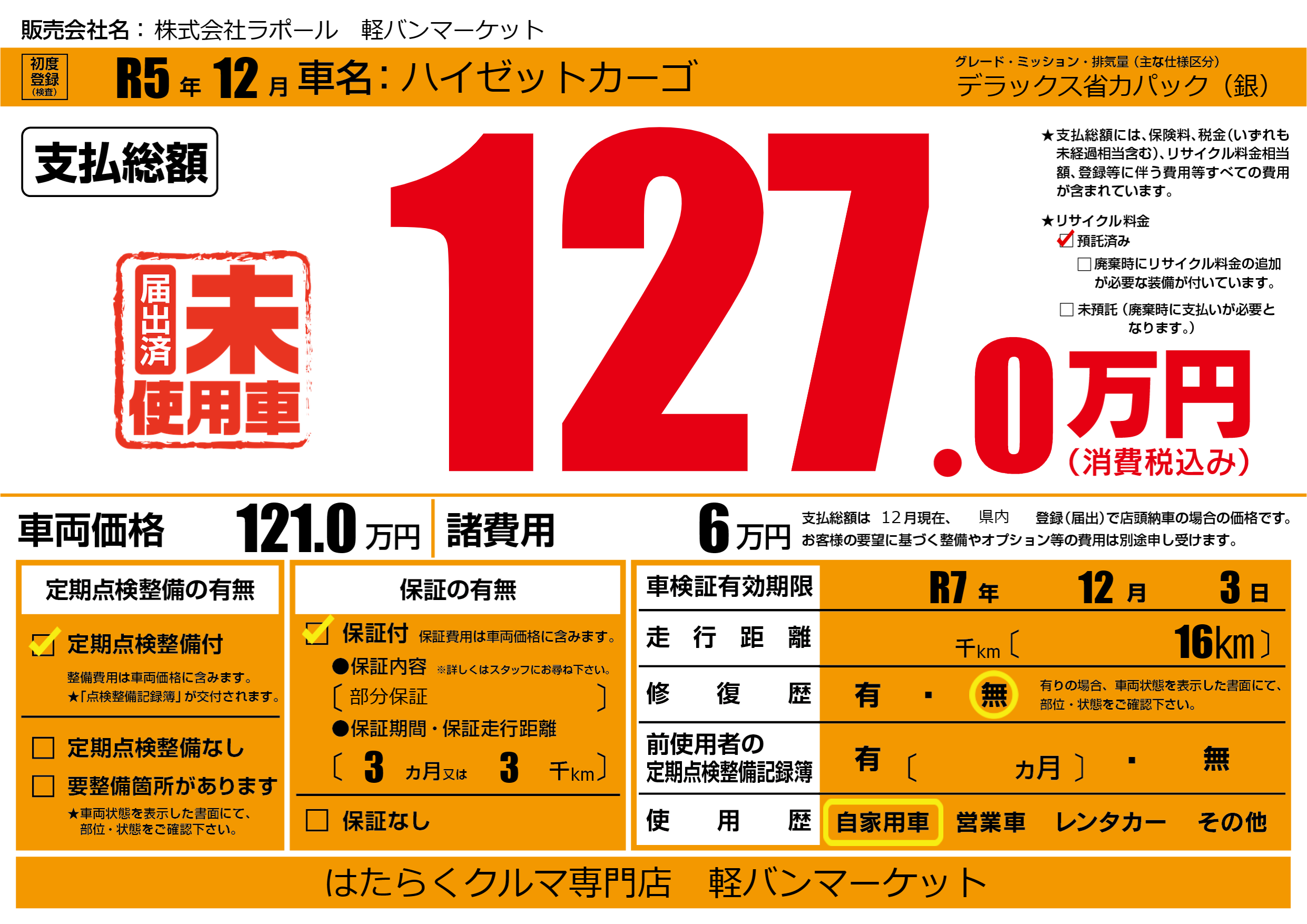 なし | 車検制限 | R7年12月3月 |