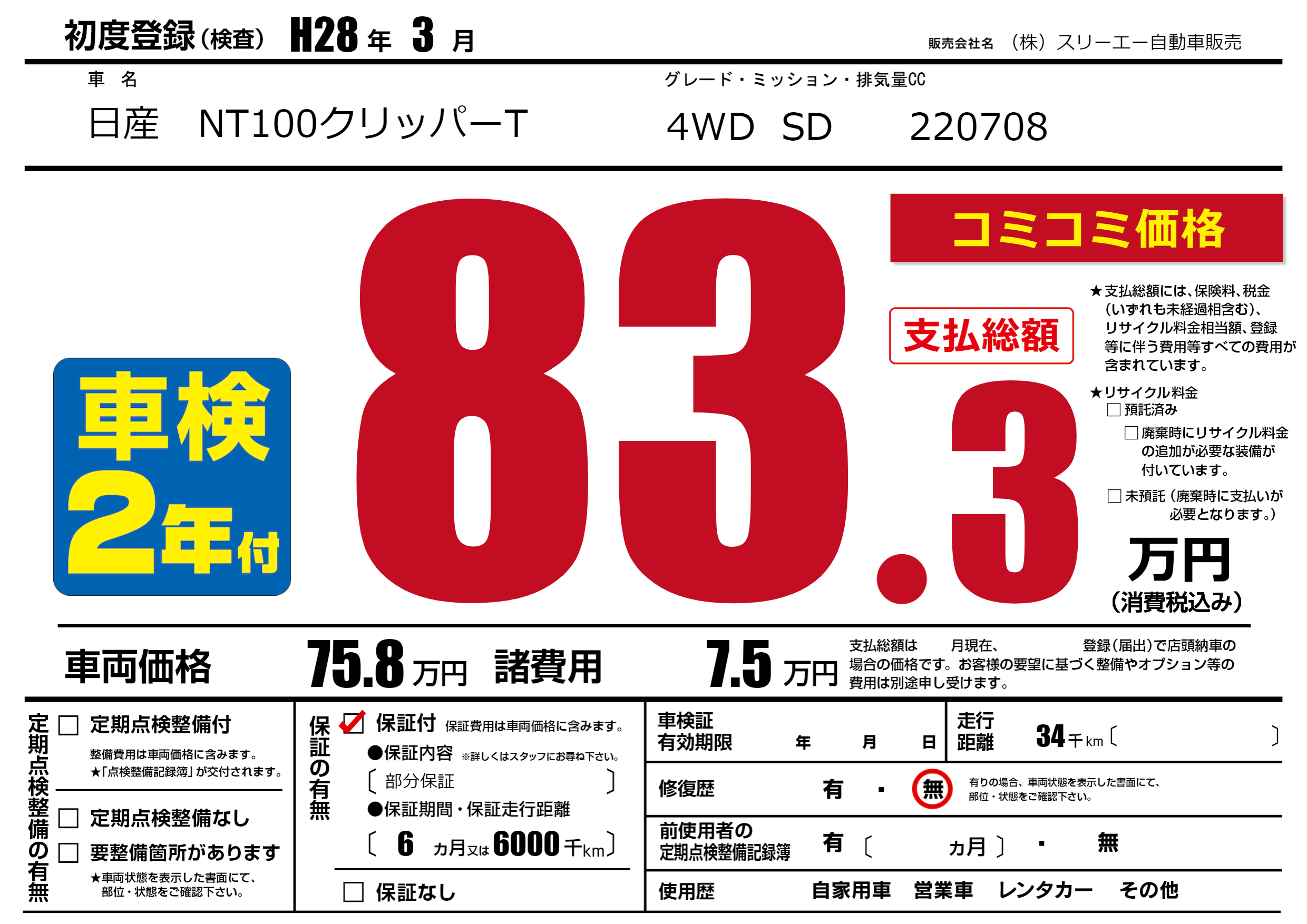 | 車名 | 日産 NT100クリッパーT | グレード ミッション 排気量 |