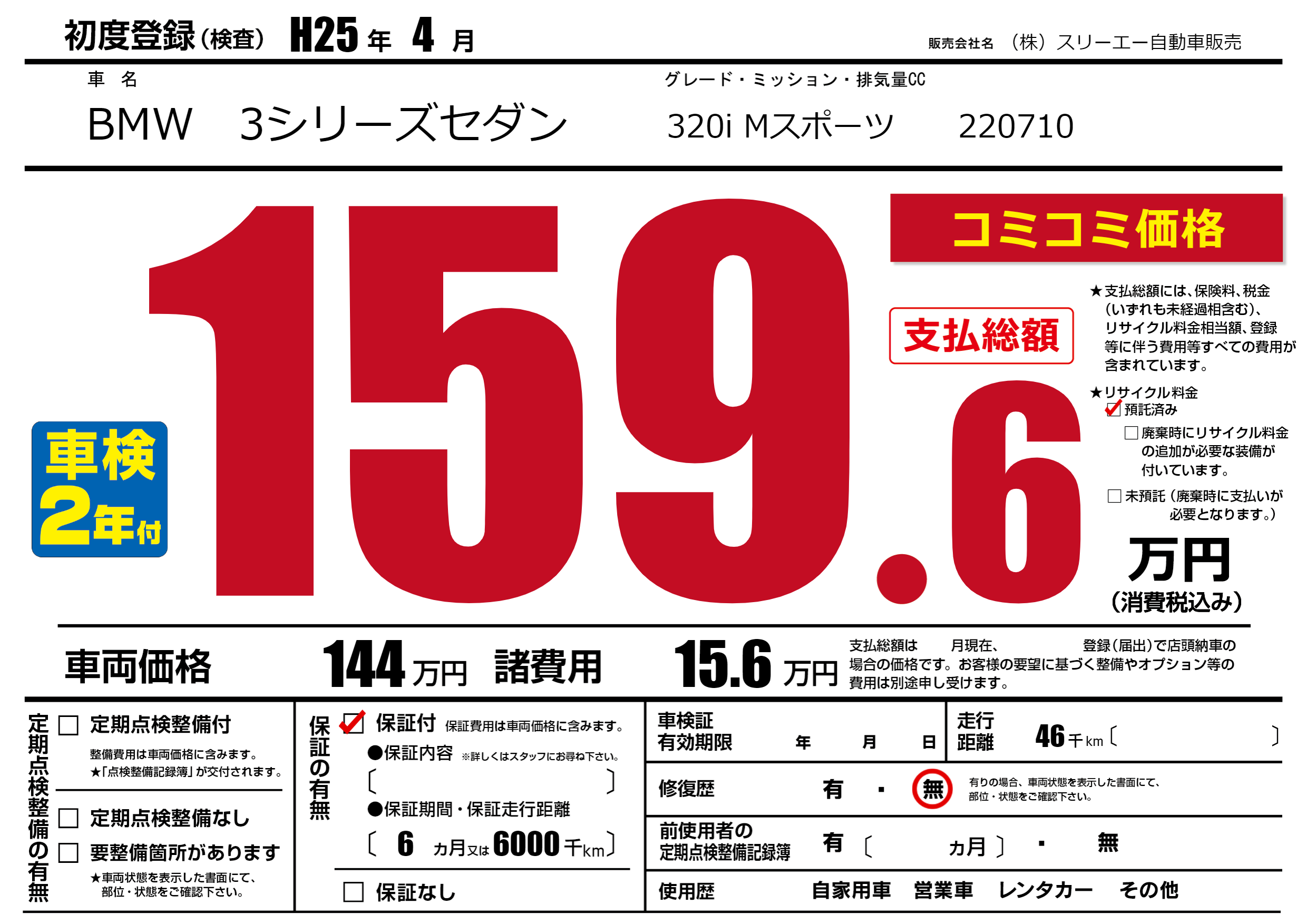 | 車名 | BMW 3シリーズセダン | グレード ミッション 排気量 |
