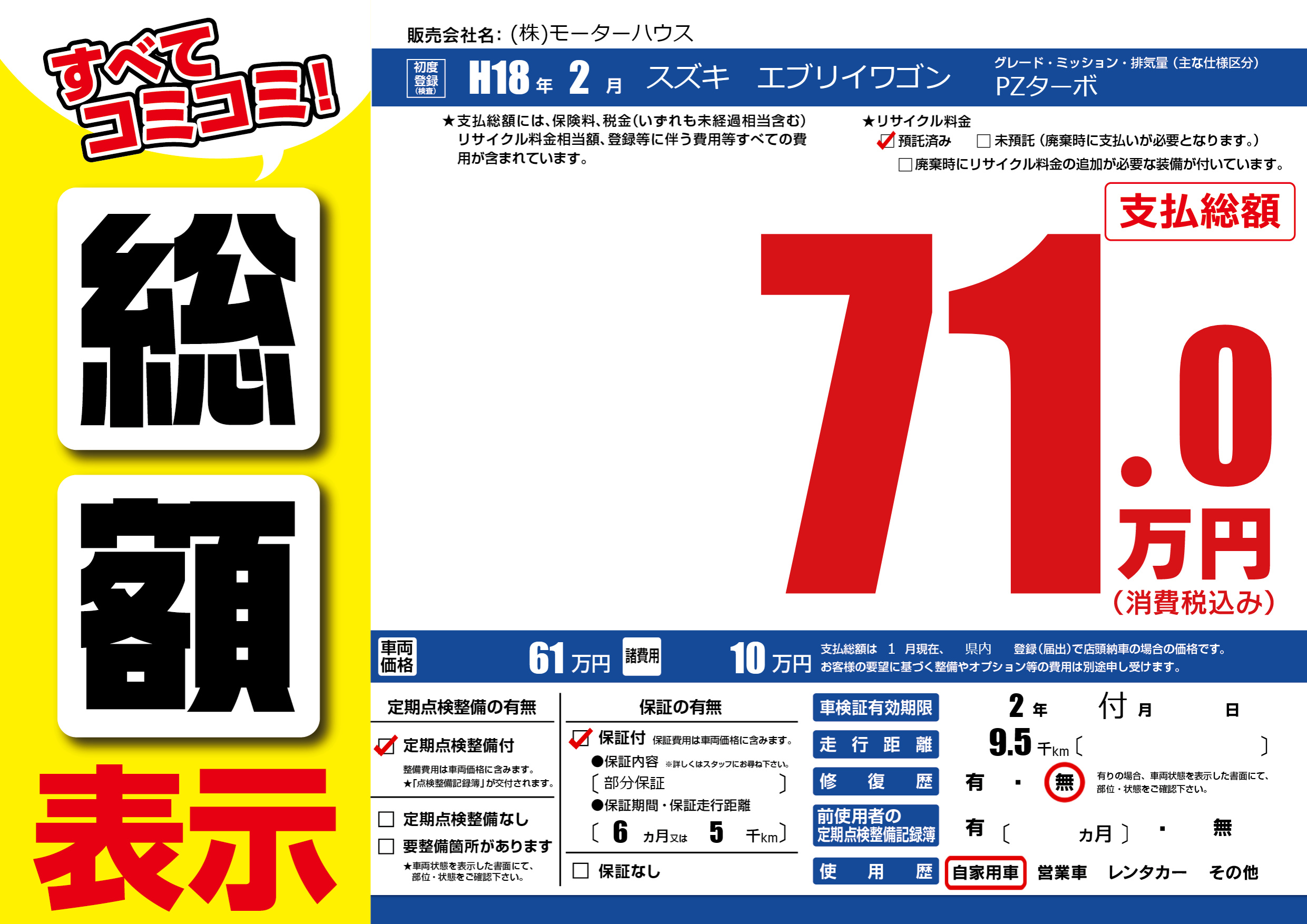 | 車名 | スズキ エブリイワゴン | グレード ミッション 排気量 |