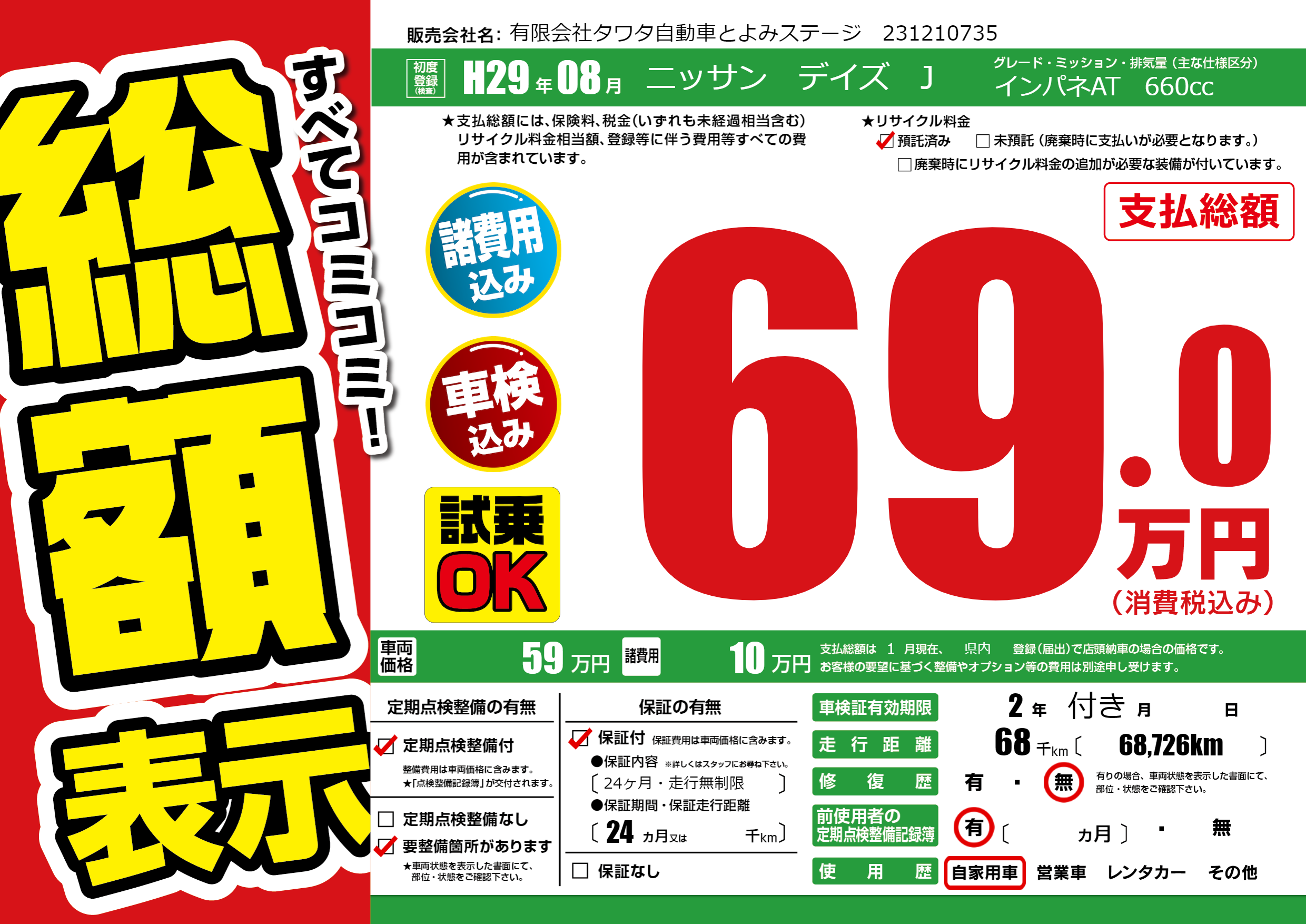 | 車名 | ニッサン デイズ J | グレード ミッション 排気量 |