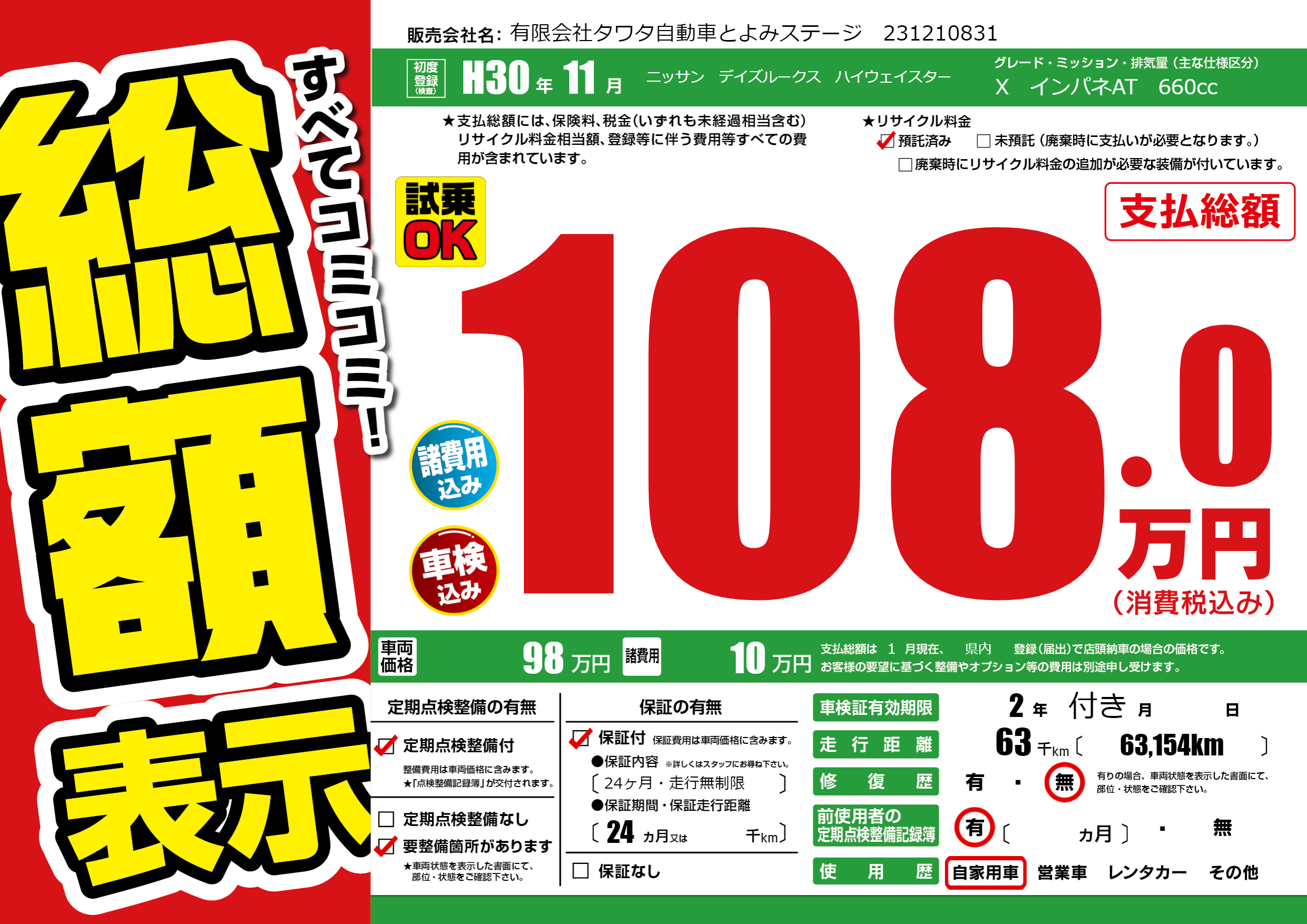 | 車検制限 | 2年 付き月 - 日 | ||